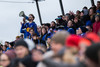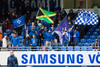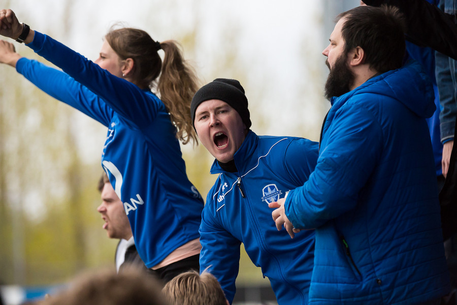 Strax komnið slatti af stuðningsmönnum Stjörnunnar. Júdas, Júdas, Júdas er kallað á Gunnar Nielsen sem labbar inn á völlinn. Hann brosir og veifar til þeirra.