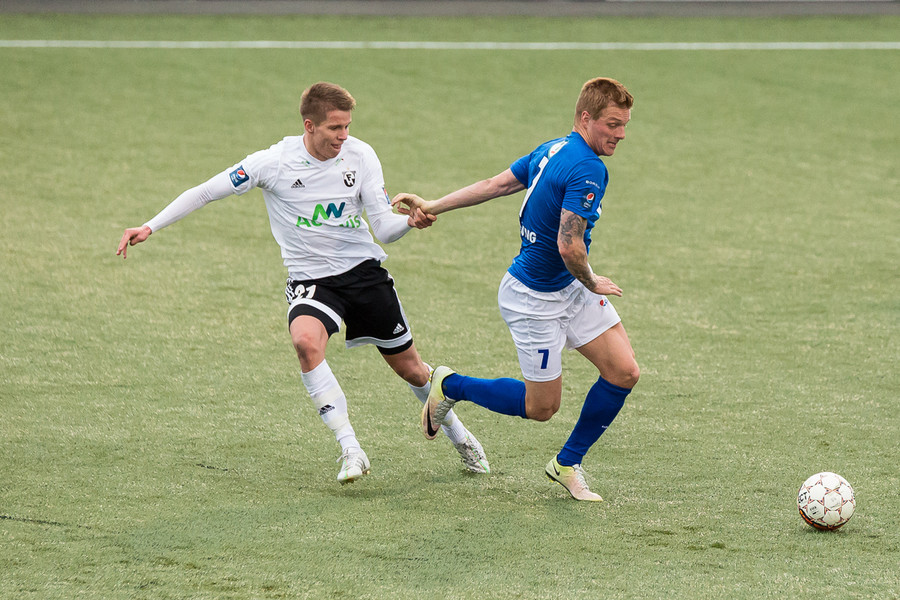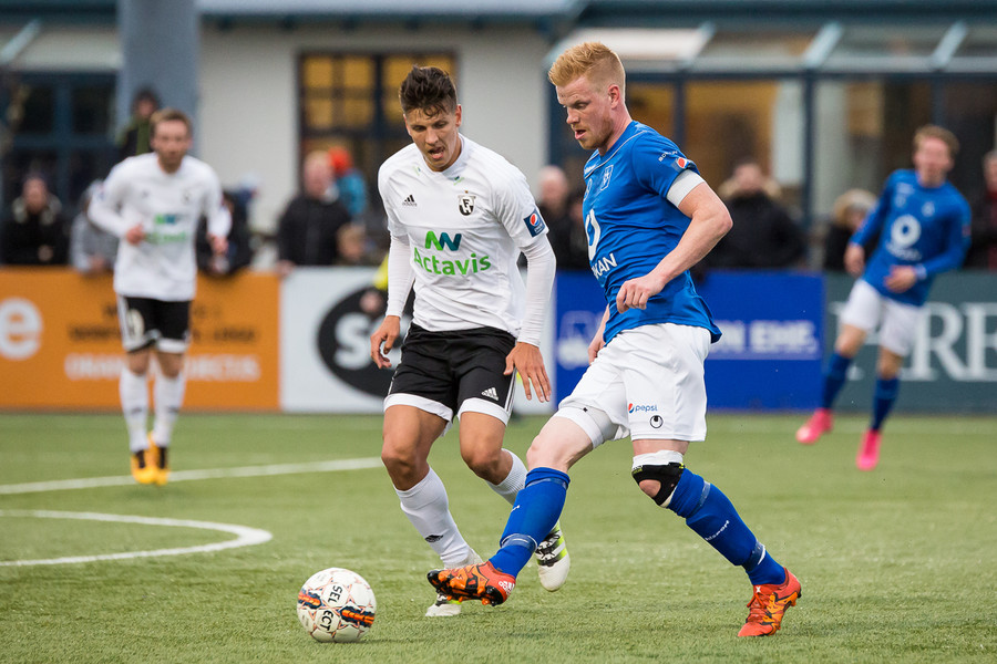 Kassim Doumbia ákvað bara að klobba Þorra Geir sem síðan braut af honum. Þorri verður að passa sig, er á gulu spjaldi.
