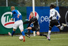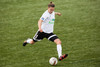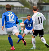 Atli Guðna fær boltann úti á kanti, fer inn að marki og reynir skot sem fer beint í fangið á Kerr.