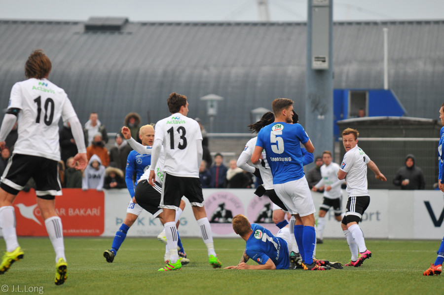 Besta færið hingað til, kominn einn gegn Gunnari en í þröngu færi og Færeyingurinn lokar vel á hann og ver í horn.