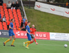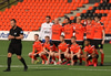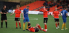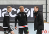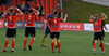 Liðin eru mætt út á völl og byrjuð að hita, gríðarlega einbeiting er hjá báðum liðum.