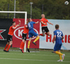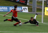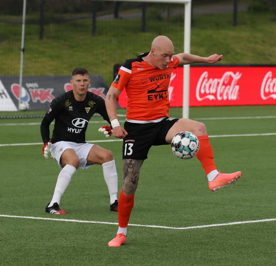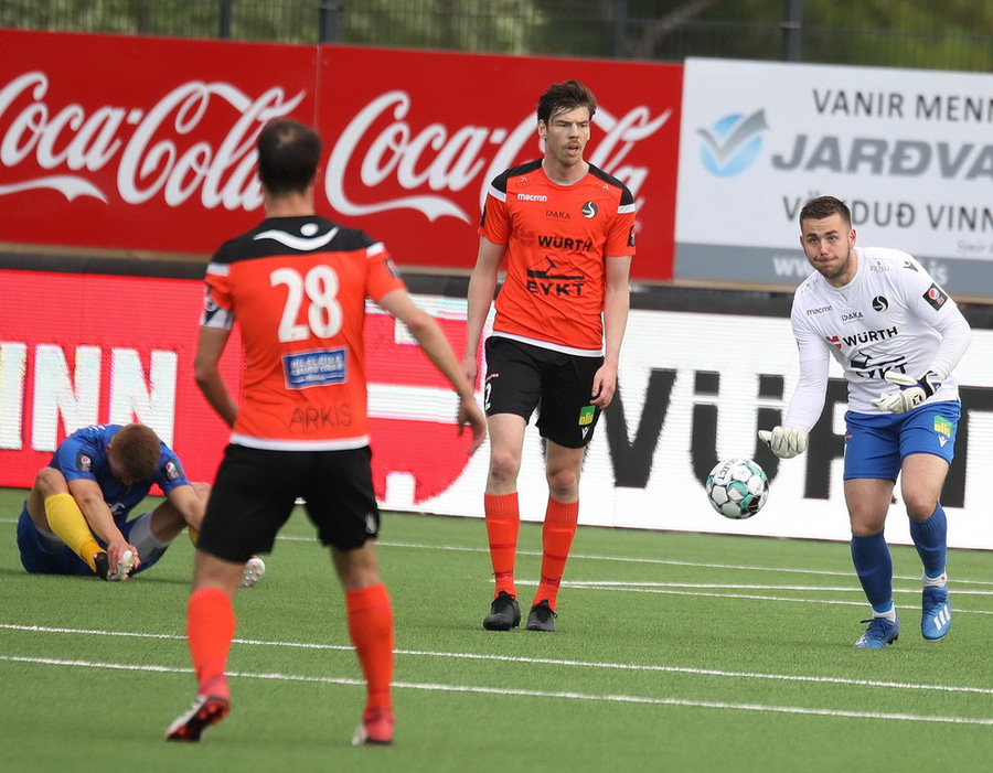 Axel Sigurðsson fær boltan innfyrir og Hákon Rafn kemur á móti og ætlar að hreinsa en setur boltan í Axel og boltin inn.
