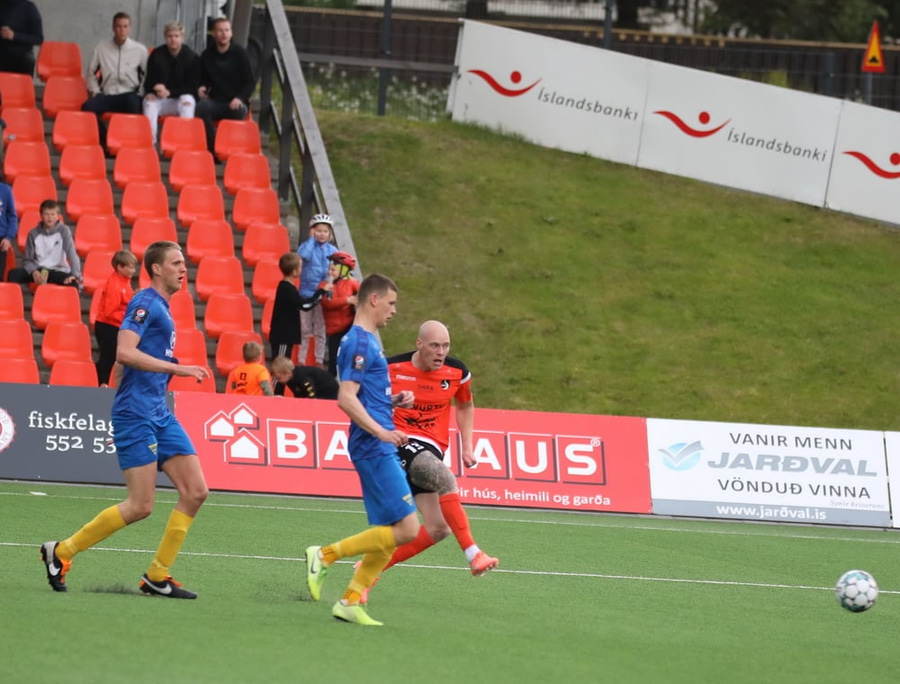 Daði Ólafs ætlar að koma með fyrirgjöf frá vinstri en það endar með ágætri marktilraun og boltin rétt yfir markið.