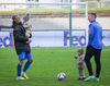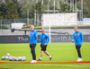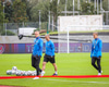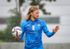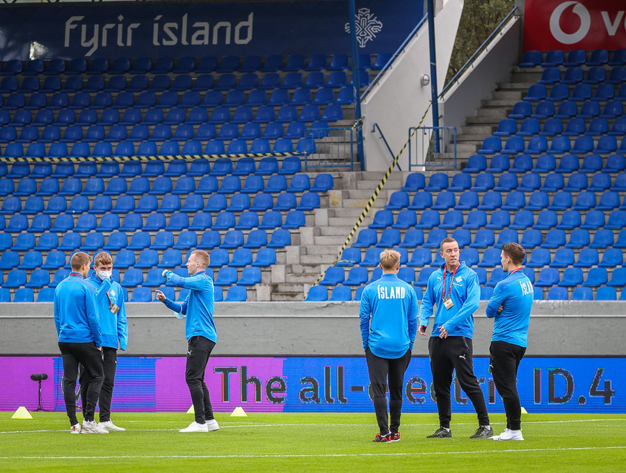 Leikmenn að skokka út í upphitun hér á Laugardalsvelli þegar rúmlega 40 mínútur eru í leik. Það hefur oftast verið meiri spenna fyrir landsleikjum en þessum í dag, það verður að segjast. Þrátt fyrir að aðeins 2.200 komist að vegna sóttvarnareglna hér á landi er enn hægt að kaupa miða á leikinn hjá krökkunum á Tix.