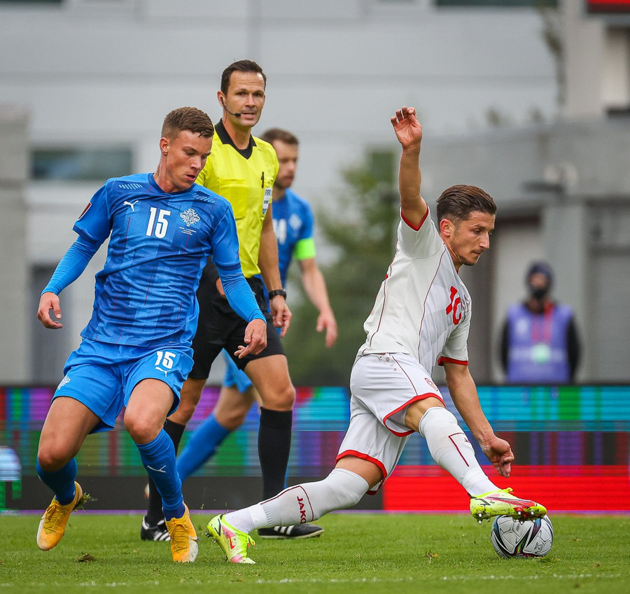 Birkir Már með fyrirgjöf frá hægri en boltinn í Alioski og afturfyrir. Ísland fær horn.