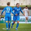 Andri Lucas Guðjohnsen!!! Hans fyrsta landsliðsmark. Albert sendir á Andra sem tekur geggjaðan snúning rétt við markteiginn og skorar!