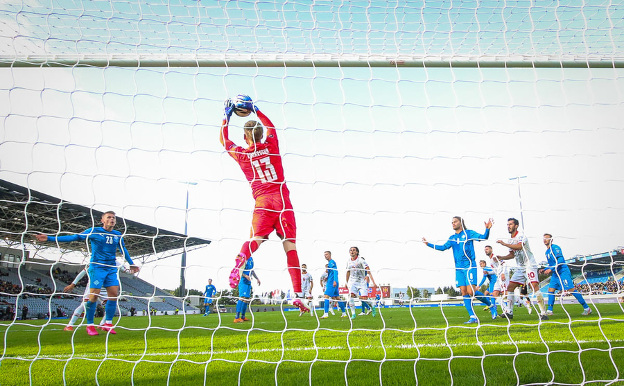 Enis Bardi með skot sem skýst af leikmanni Íslands og í hornspyrnu. Fyrsta hornið sem gestirnir fá.