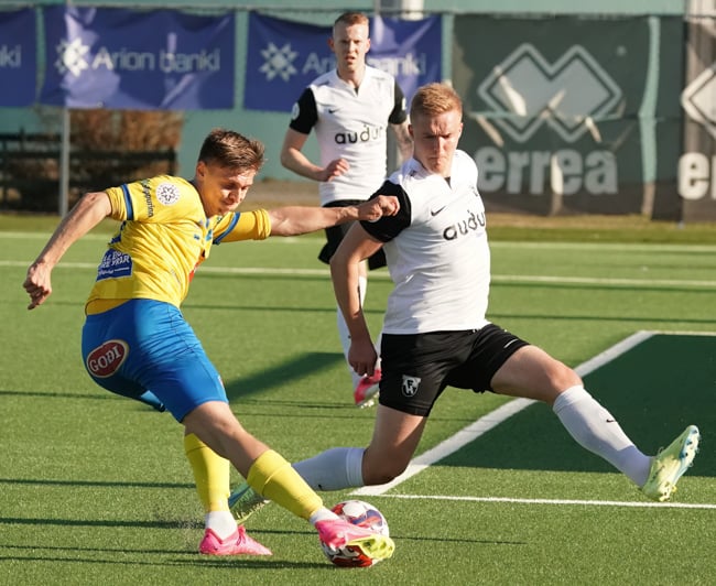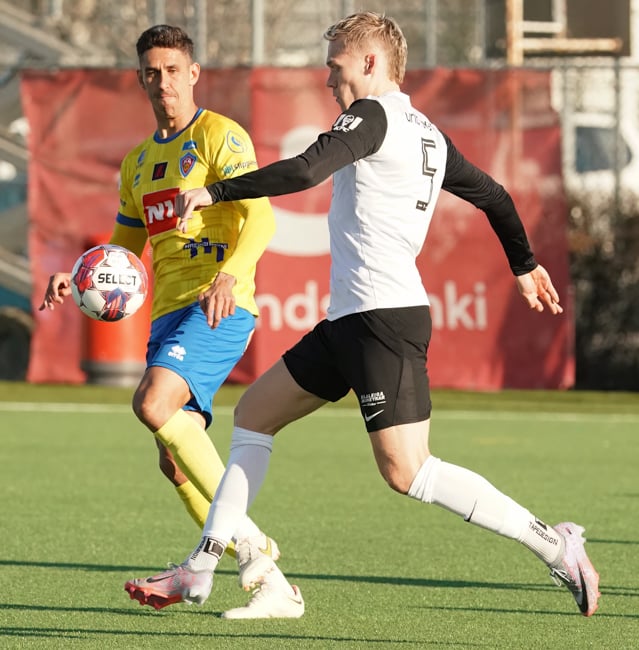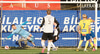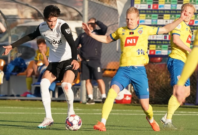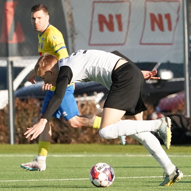 Boltinn barst til Daníels Hafsteinssonar eftir brotið á Birni og Dani Hatakka fór ansi hátt með sólann á undan sér. Daníel er þó heill á húfi.