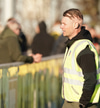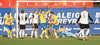 Þetta er að bresta á. Liðin ganga hér út á völl. Sól og blíða og stemning í stúkunni.
