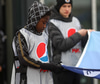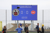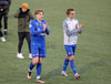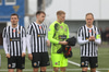 Liðin ganga inn á völlinn, KR í hefðbundnu svörtu og hvítu. HK er í nýju Sampdoria búningunum.