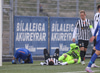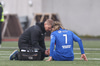 Örvar nær ekki í háan bolta og liggur eftir. Grunar að þetta sé tognun.