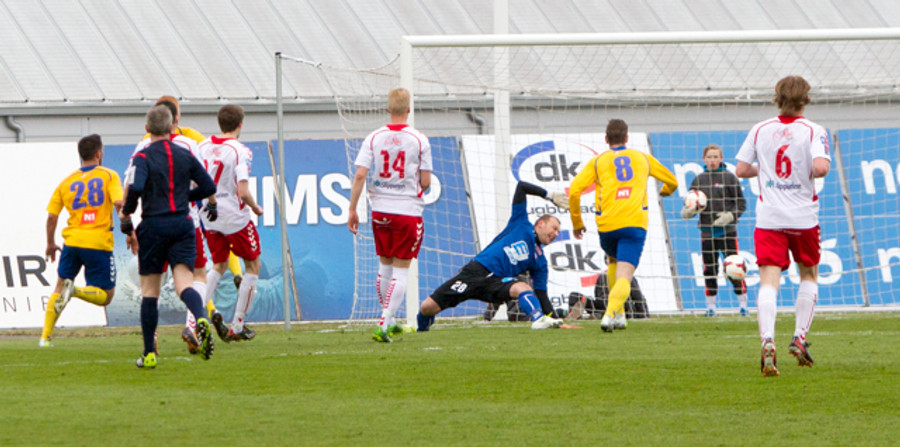 STÓRKOSTLEG MARKVARSLA. Sandor Matus með eina geggjaða markvörslu. Skot nánast af markteig.