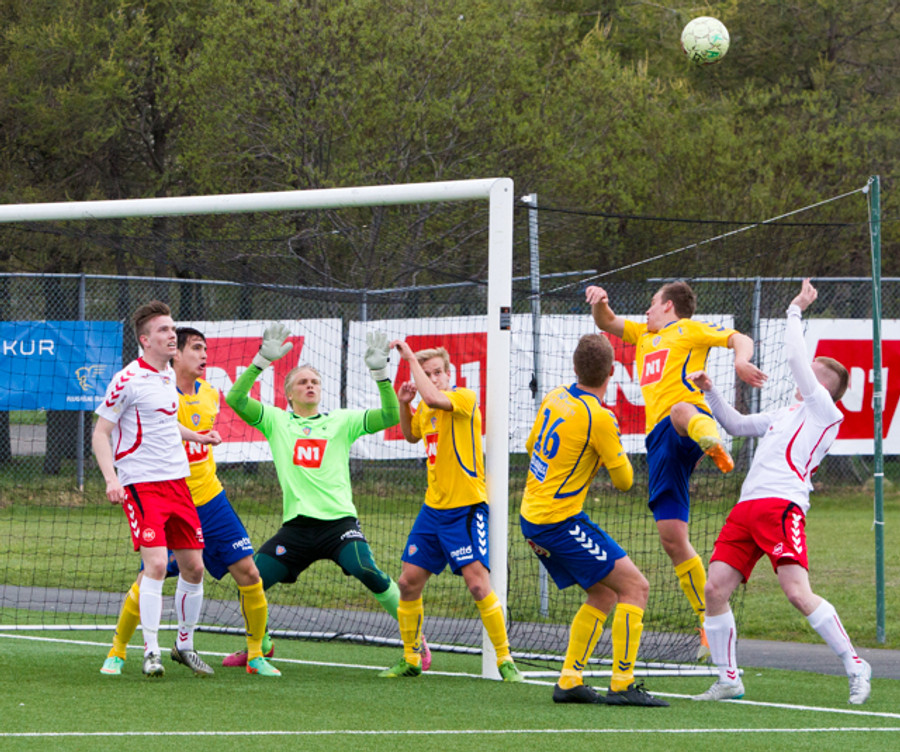 Gestirnir hafa jafnað. Bolti frá hægri sem Guðmundur Atli tekur innan fótar í markið