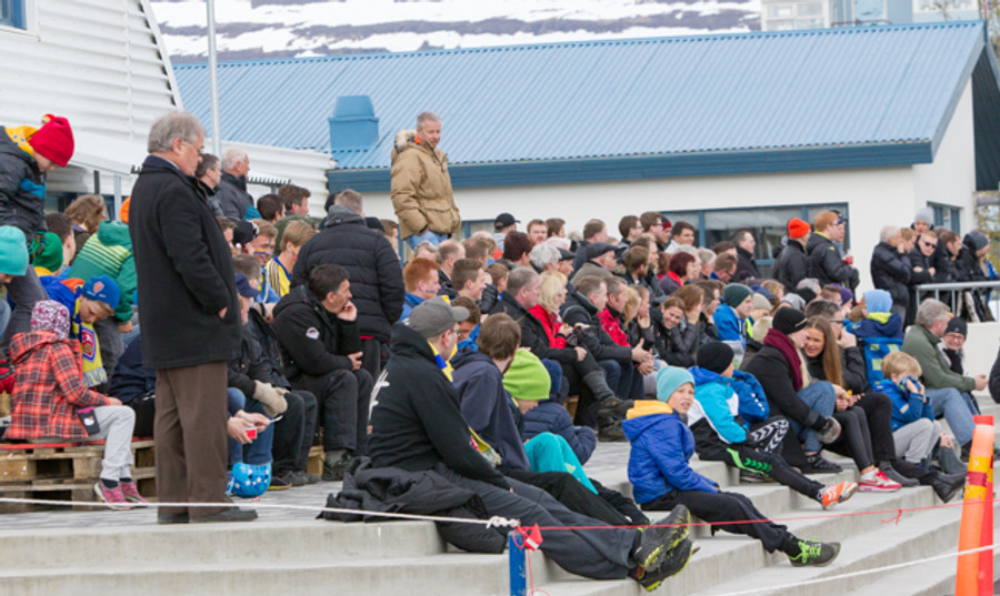 Fínasta veður til knattspyrnuiðkunar er hér á KA-vellinum í dag, skýjað, gola og 8°