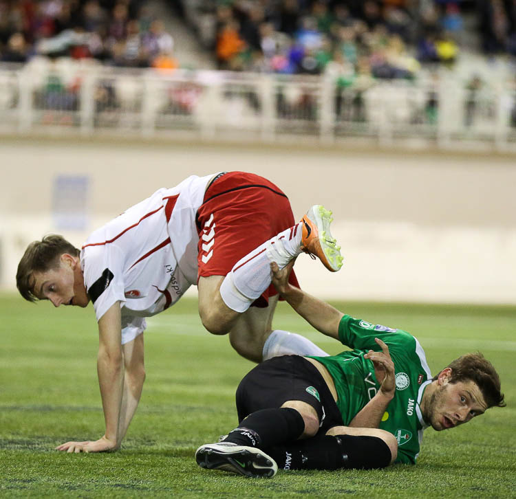 Elfar Árni fellur inn í vítateig HK eftir baráttu við Andra Geir Alexandersson en ekkert dæmt. Hefði verið strangur dómur en Andri Geir rétt "touch-aði" hann.