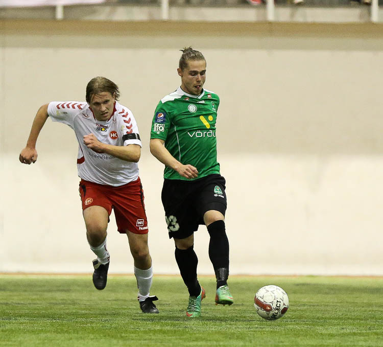HK-ingar eru mættir til leiks í seinni hálfleik! Hörður Magnússon með skot rétt yfir markið, rétt fyrir utan vítateiginn. Það var enginn sem mætti Herði og því um frítt skot að ræða.