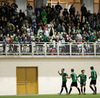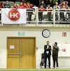 Leikmenn liðanna ganga inn á völlinn, og áhorfhendur taka vel á móti þeim. Það mættu alveg vera fleiri áhorfendur hér í Kórnum.