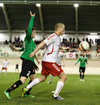 Beitir Ólafsson ver af stuttu færi frá Olgeiri Sigurgeirssyni eftir fyrirgjöf á nærstöngina frá Höskuldi Gunnlaugssyni.