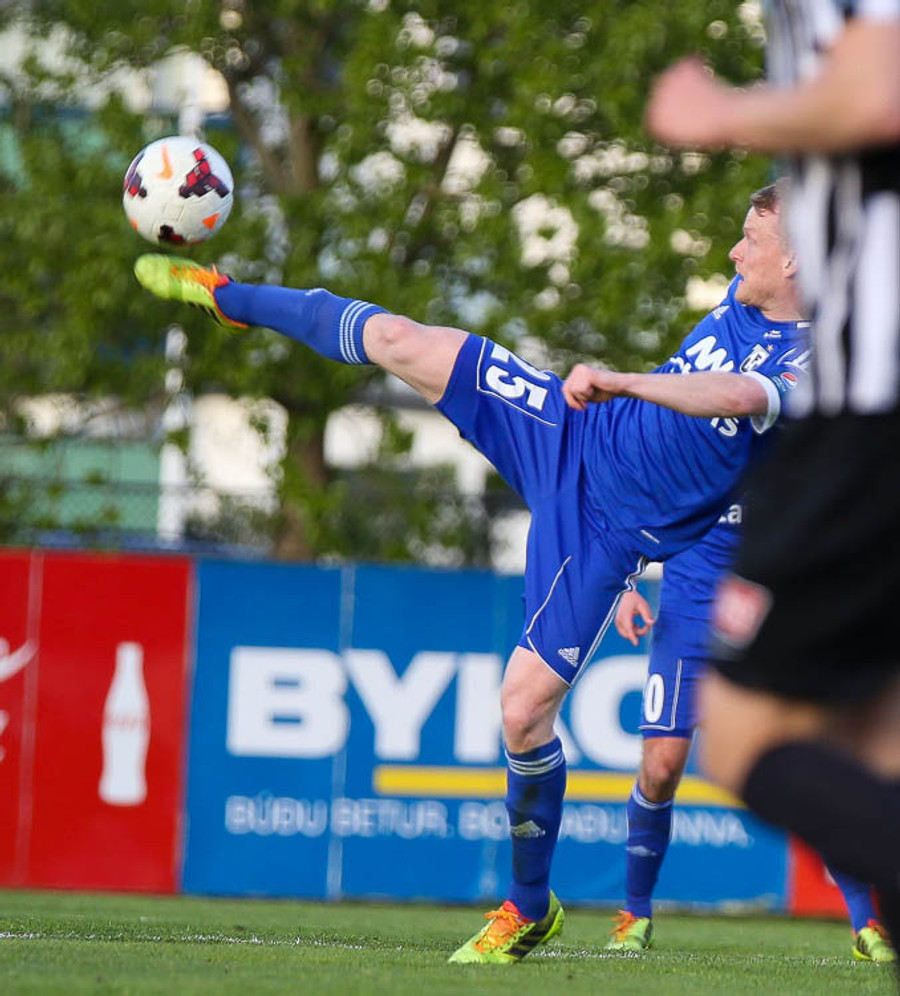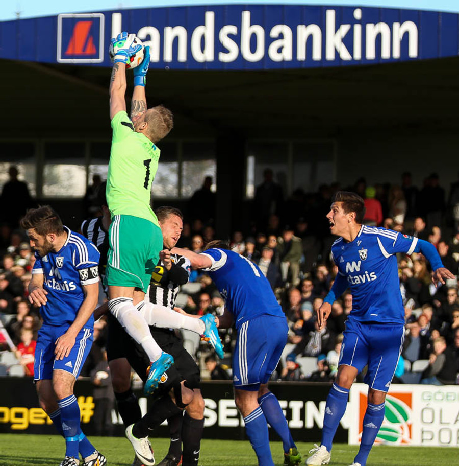 Sam Hewson með skot sem fer í Albert Brynjar sem er rangstæður. Stefán Logi varði hvort sem er.