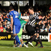 Mikil læti voru eftir brotið við hliðarlínuna. Stefán Logi hljóp úr markinu á vettvang og fær gult spjald fyrir sinn þátt.