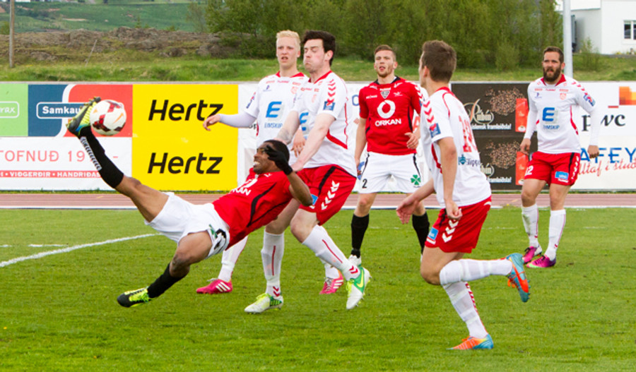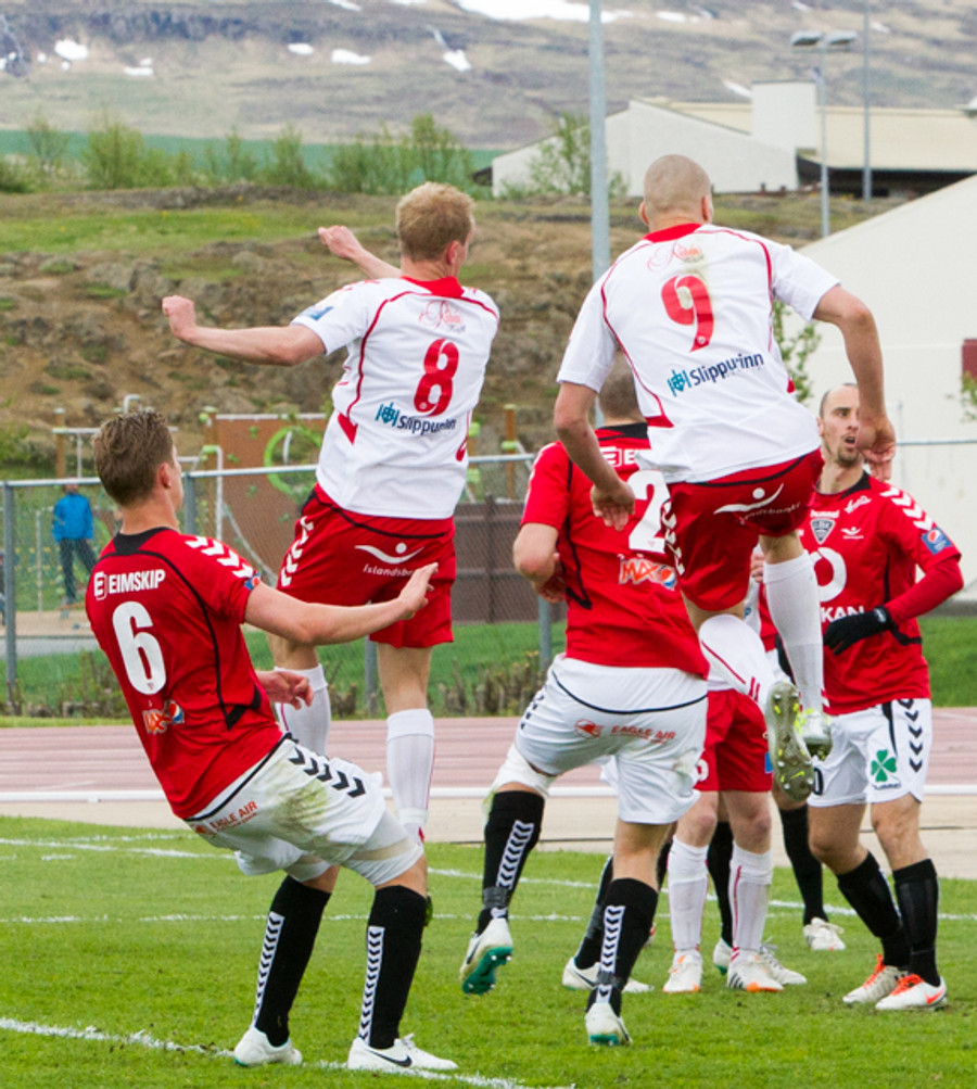 Hlynur Atli með frábæra aukaspyrnu frá miðlínu, beint á hausinn á Jóhanni Helga sem átti lausan skalla á Abel.