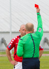 Eins og skrifað í skýin, Deano fær rautt fyrir olnbogaskotið. Áhorfendum leiðist þetta ekki.