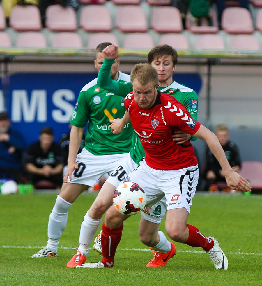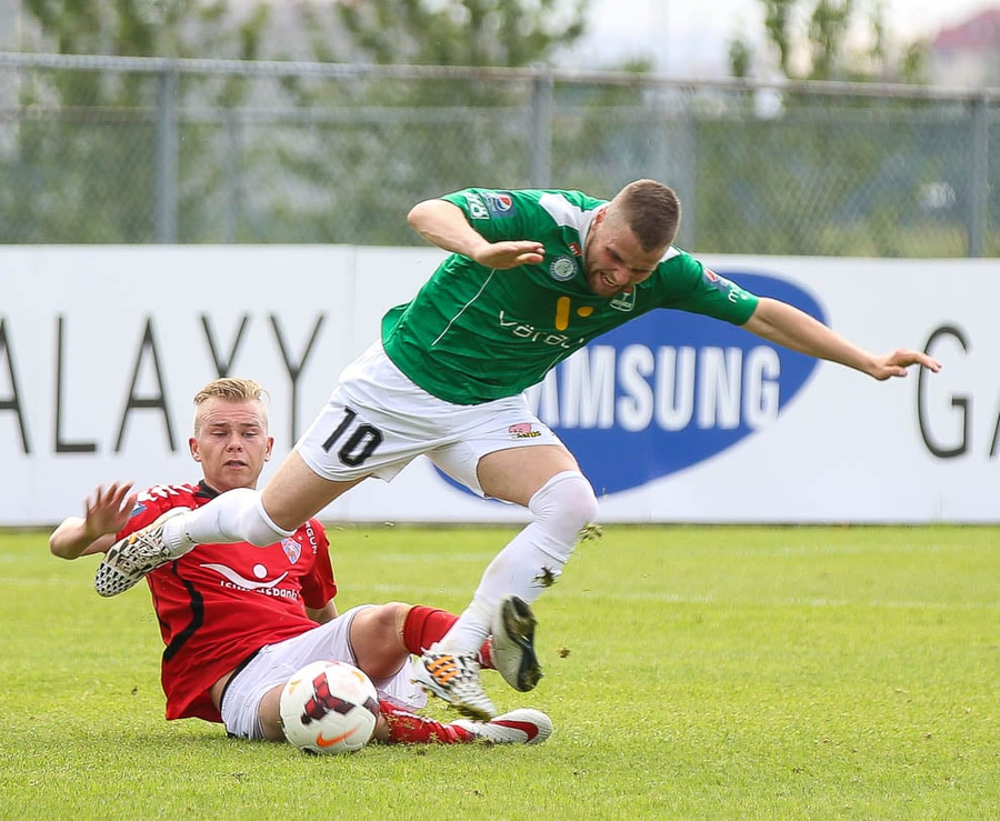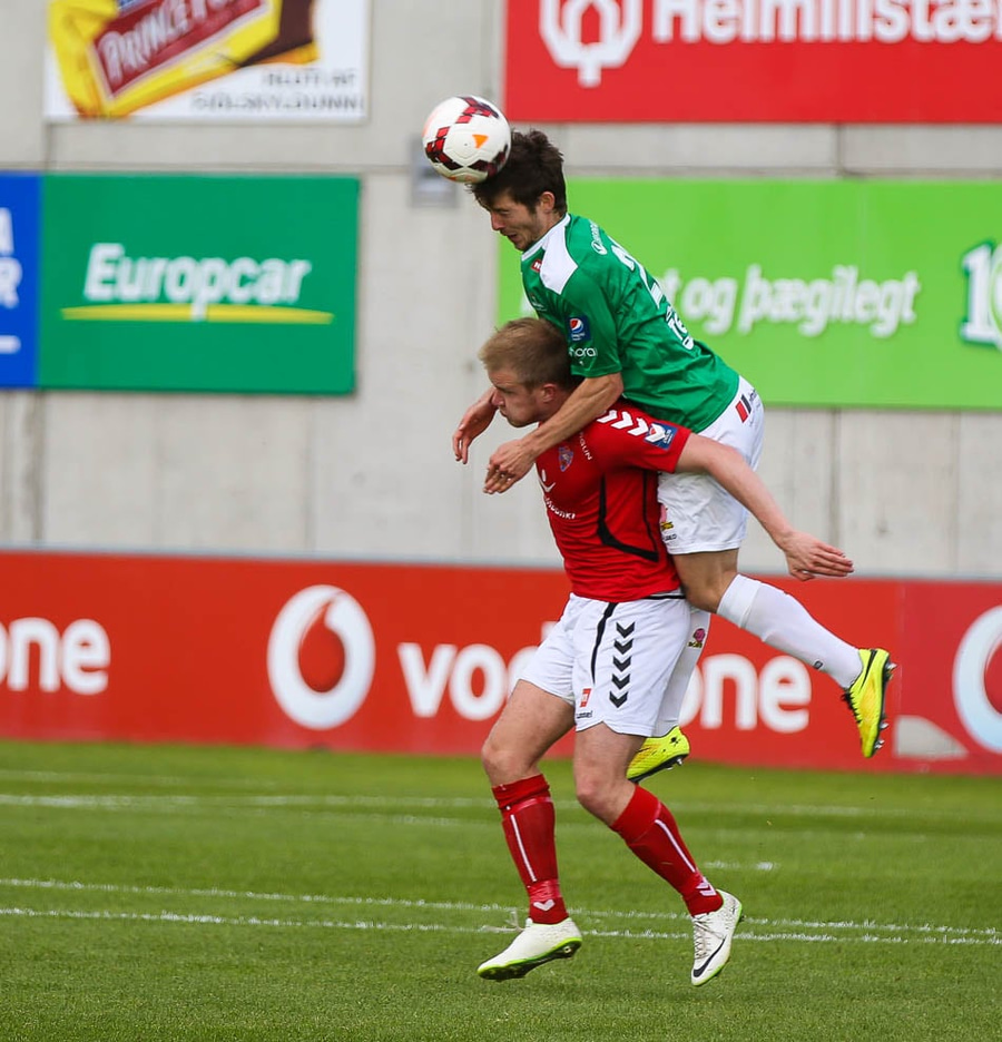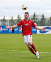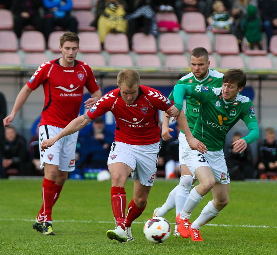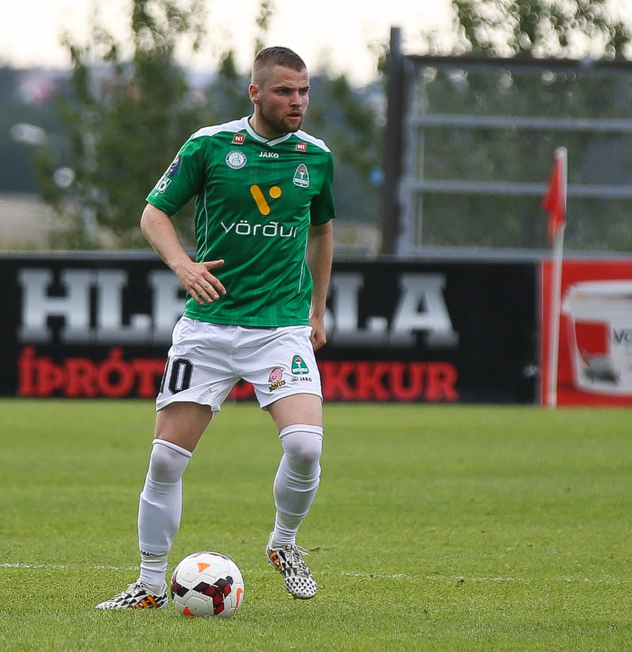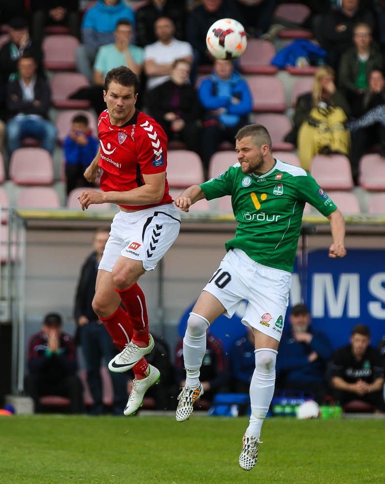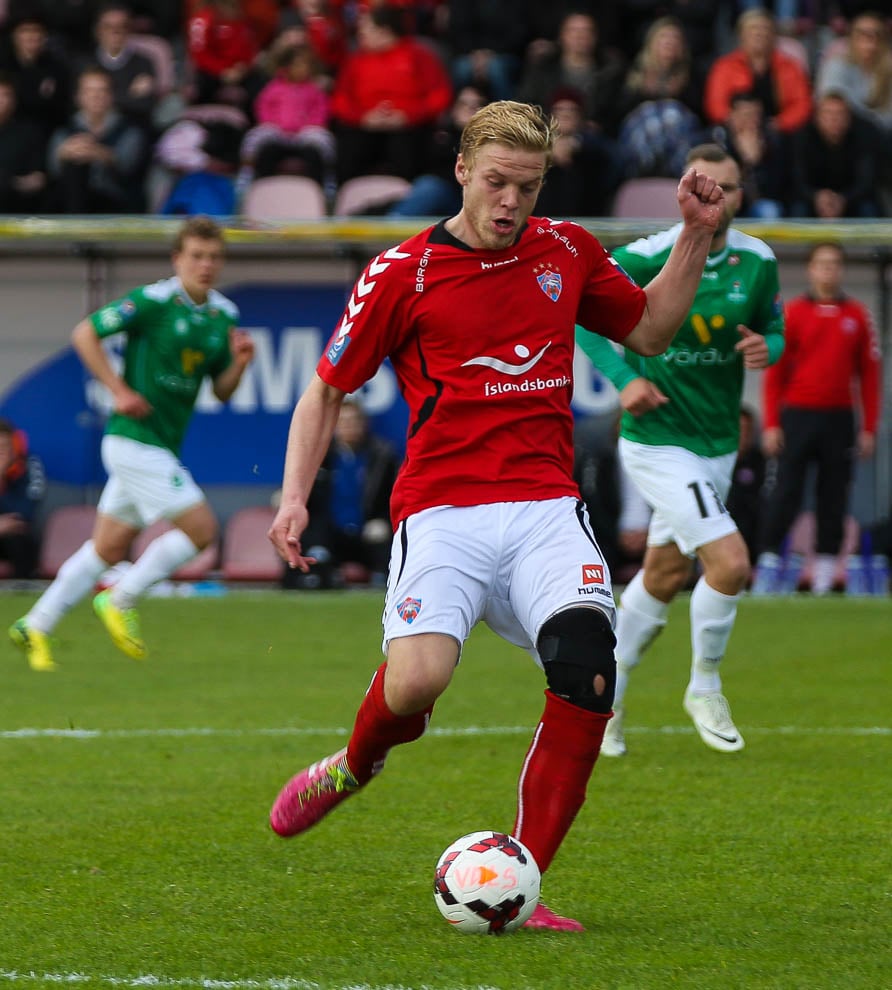 Árni Vilhjálms skaut yfir markið með bakfallsspyrnu en Elfar Árni hafði flikkað innkast Höskulds aftur fyrir sig og fyrir Árna.