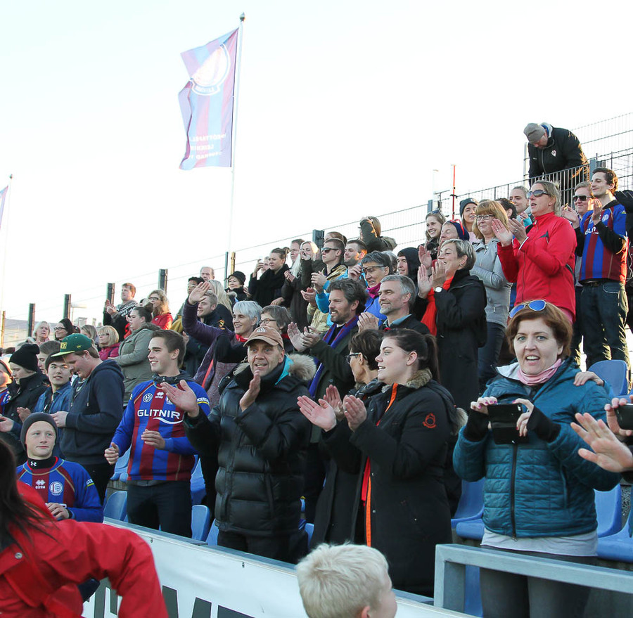 17:56 In The Ghetto með Elvis byrjað að hljóma í Breiðholtinu og um leið ganga liðin út á völlinn. Fjörið er að byrja.