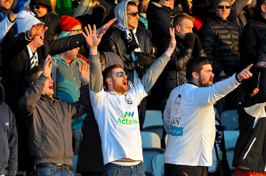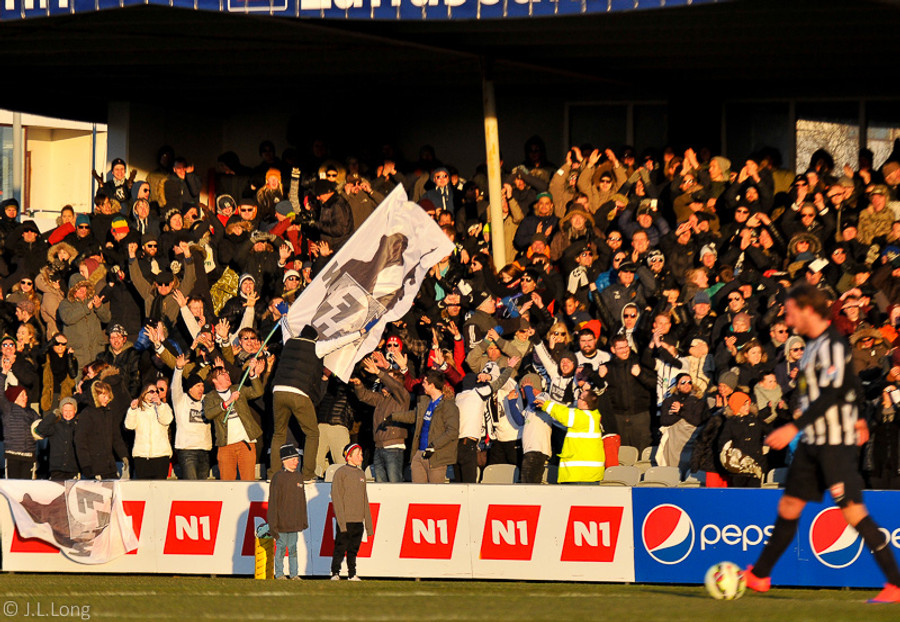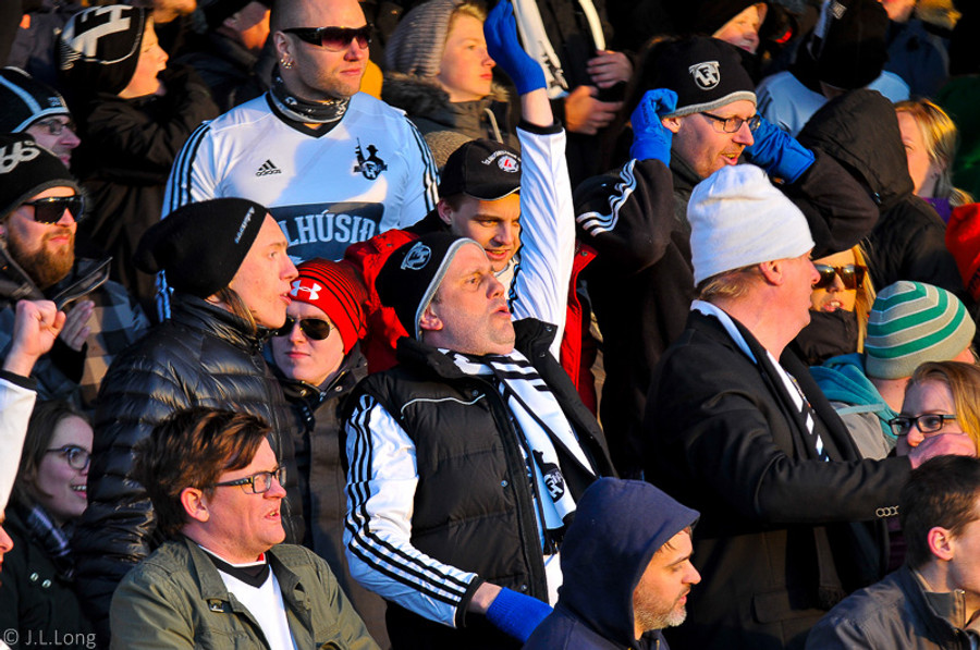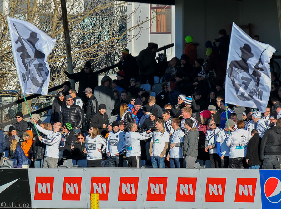 Ofboðslegur kuldi hér á KR-vellinum. Fólk er duglegt að dansa við tónlistina í hálfleik til að halda á sér hita.