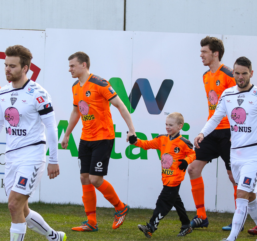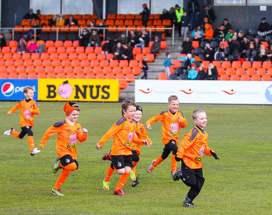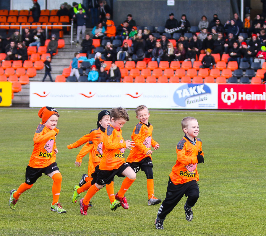 Liðin eru mætt út á völl. Allt að verða klárt og fólk streymir í stúkuna. Líf og fjör!