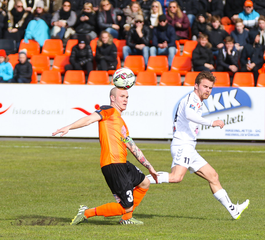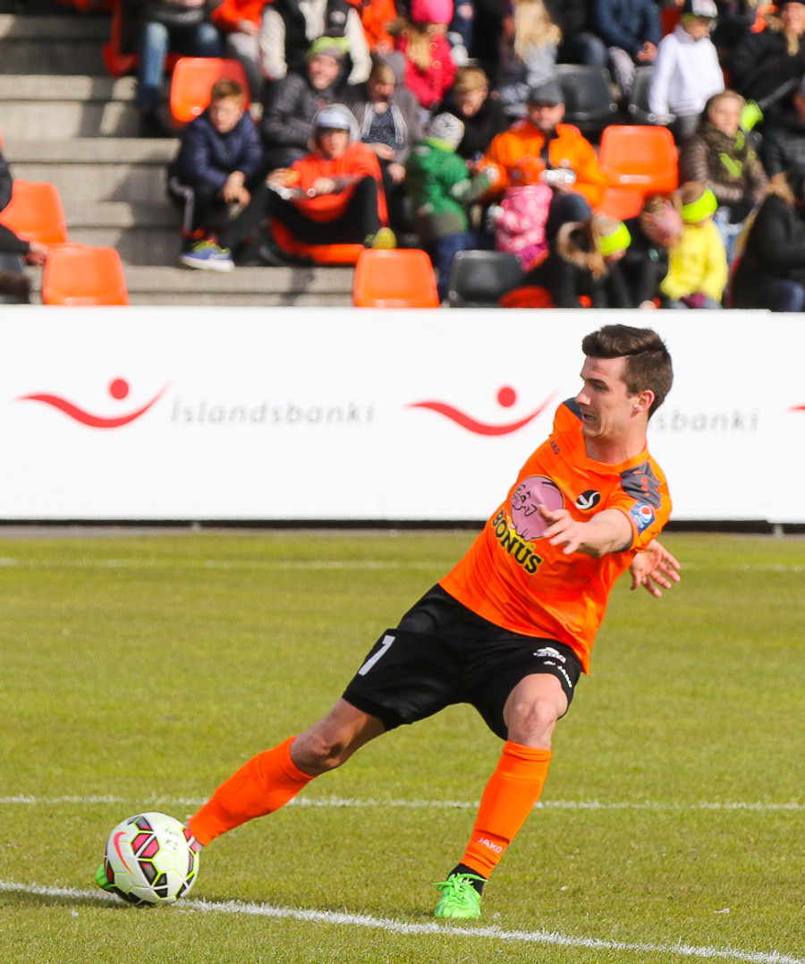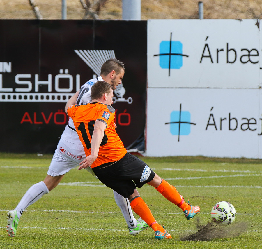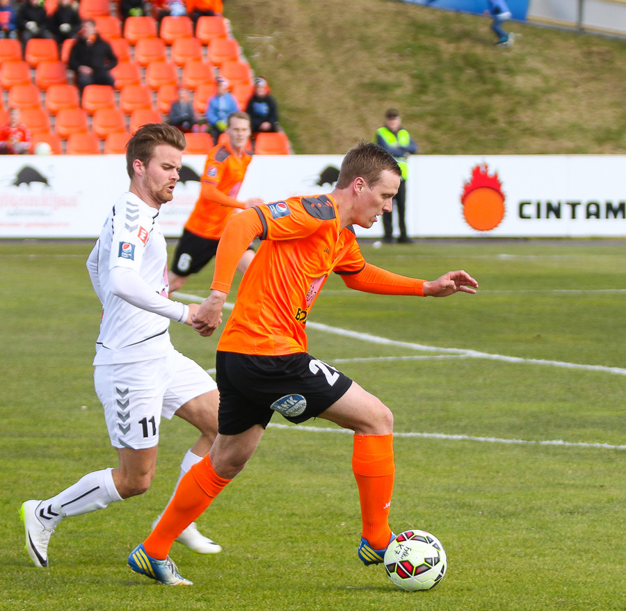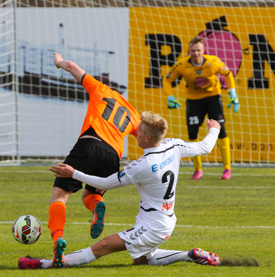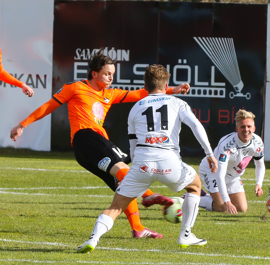 Vinstri bakvörðurinn Daði reynir þrumuskot utan af velli. Guðjón Orri ver í horn. Andrés Már tekur hornið en mér sýnist það vera Radovinkov sem setur boltann framhjá.