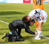 Glenn er stór og sterkur og Daði rífur hann niður við miðjan völl. Eyjamenn vilja gult á Daða en Garðar Örn sleppir honum með tiltal.