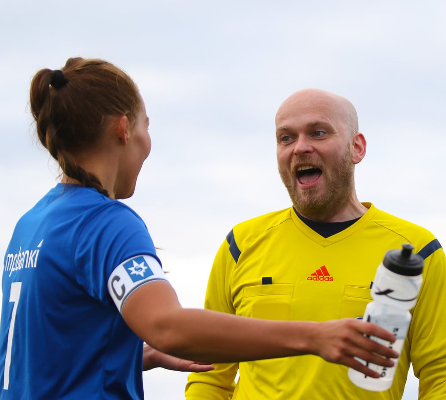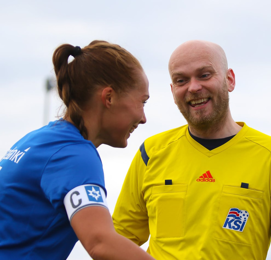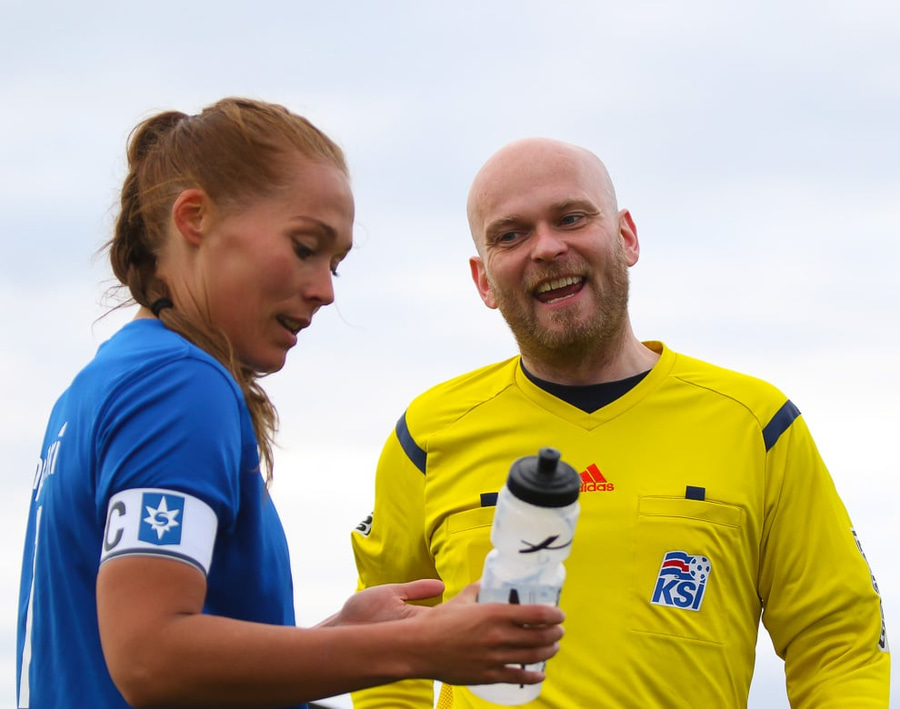 Ásgerður Stefanía er með brúsa í hendinni út við hliðarlínunni þegar boltinn berst þangað. Ásgerður fer í baráttu um boltann með brúsann í hendinni en það er bannað. Garðar Örn rífur upp gula spjaldið