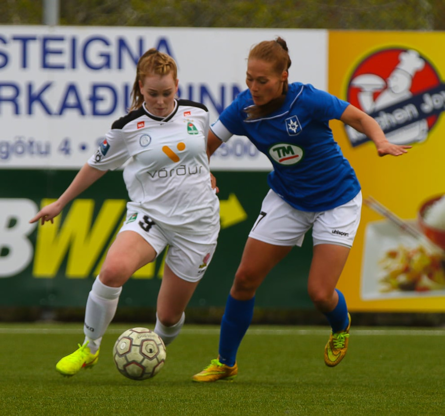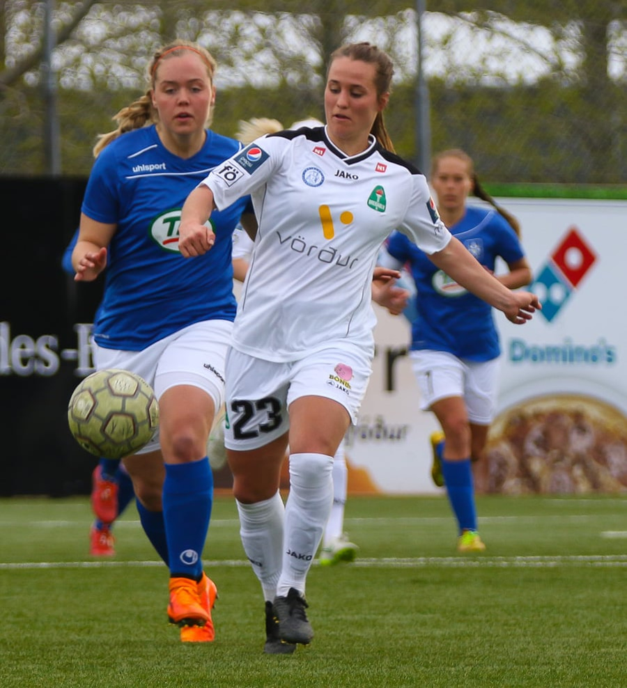 Guðrún gerir hinsvegar vel og hleypur Írunni uppi og tekur boltann af henni að ný.
