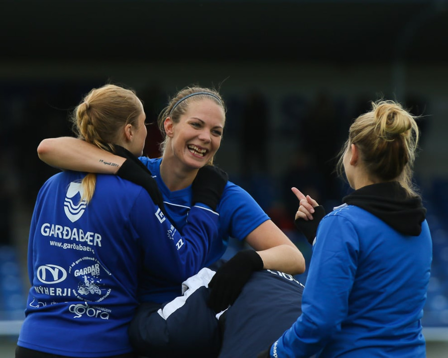 Breiðablik leikur í hvítum búningum, stuttbuxum og sokkum. Einhverjar með hanska aðrar ekki.