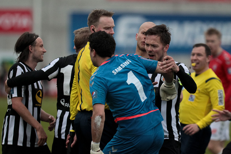 Þóroddur dæmir markspyrnu.