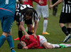 Leikurinn er varla byrjaður og Haukur Páll býður Pálma Rafn velkomin til baka á Hlíðarenda og tæklar hann hressilega. Pálmi liggur eftir og fær aðhlynningnu utan vallar.