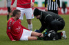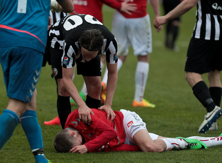 Haukur Páll liggur eftir og fær aðhlynningu.