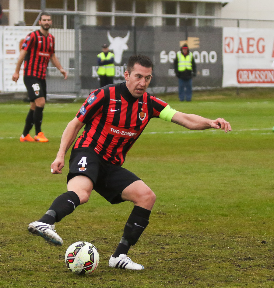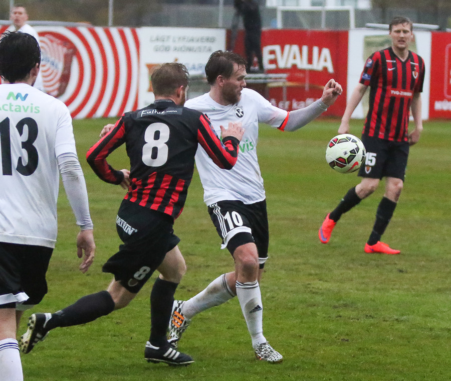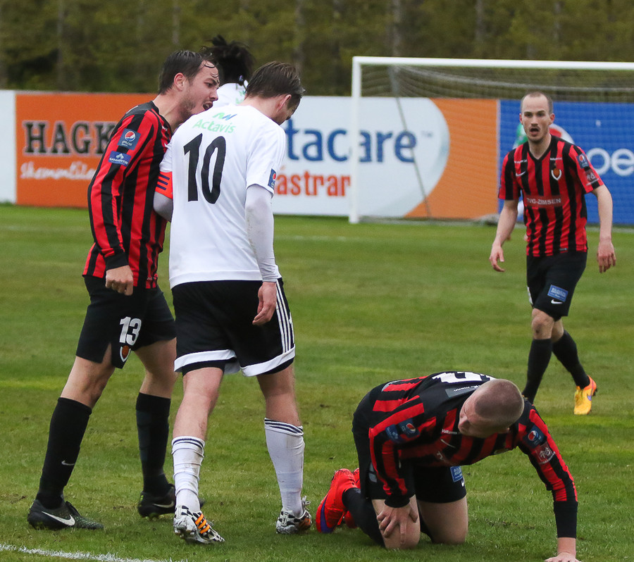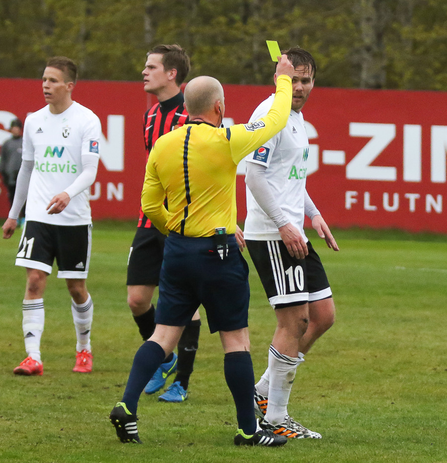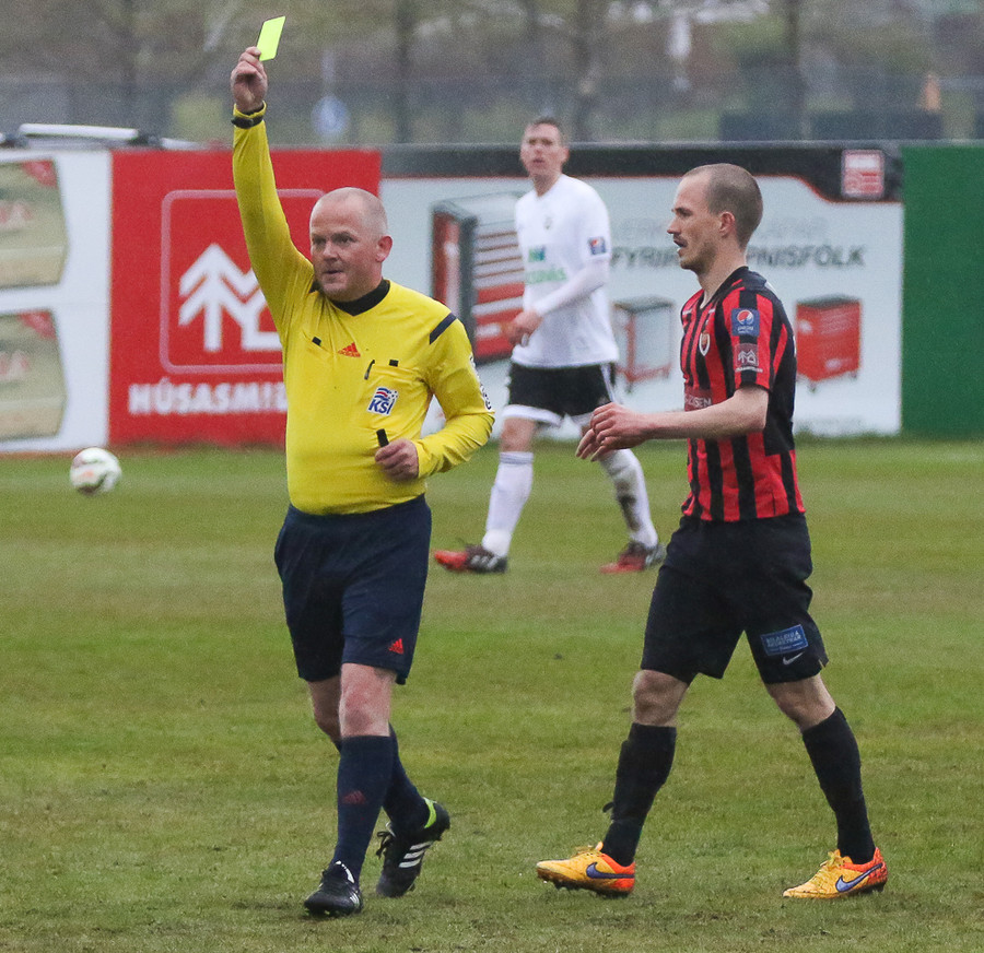 Davíð Þór fær gult fyrir ljótt brot. Hefði mögulega getað verið rautt frá mínu sjónarhorni