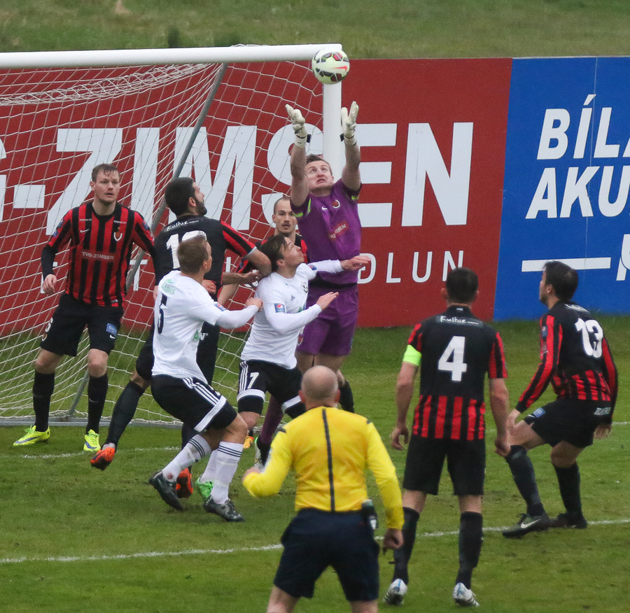 Nielsen í bullandi vandræðum með að kýla boltann eftir hornspyrnu FH inga en náði boltanum að lokum.