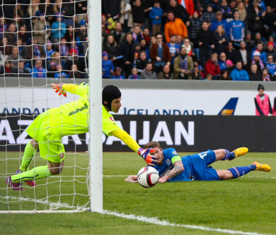 Rangstæðu-gildra vörn Íslendinga klikkaði hrikalega og Krejci var kominn einn innfyrir en síðasta snerting hans, sveik hann gjörsamlega og Hannes náði til boltans.