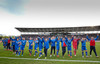 Íslenska liðið í bláum búningum og Tékkarnir í hvítum.