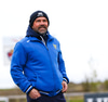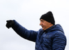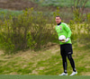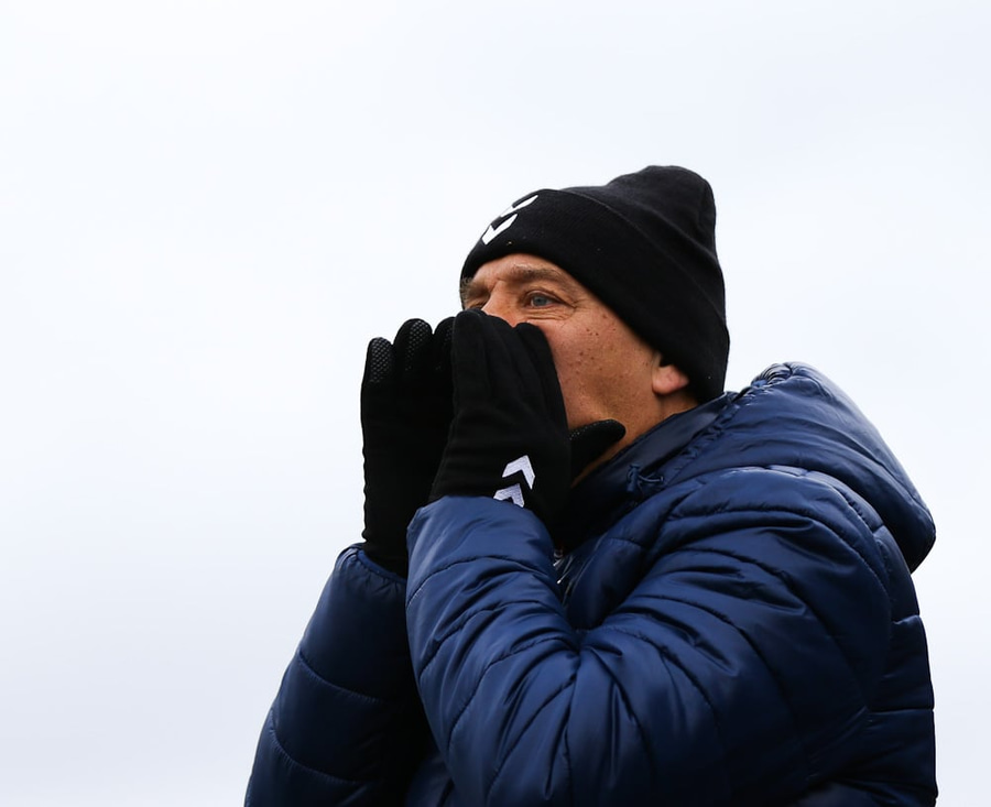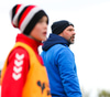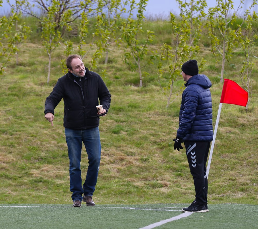 Jónmundur ætlar greinilega ekki að vera kalt á vellinum í kvöld. Hann er klæddur í hanska og gammósíur.