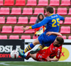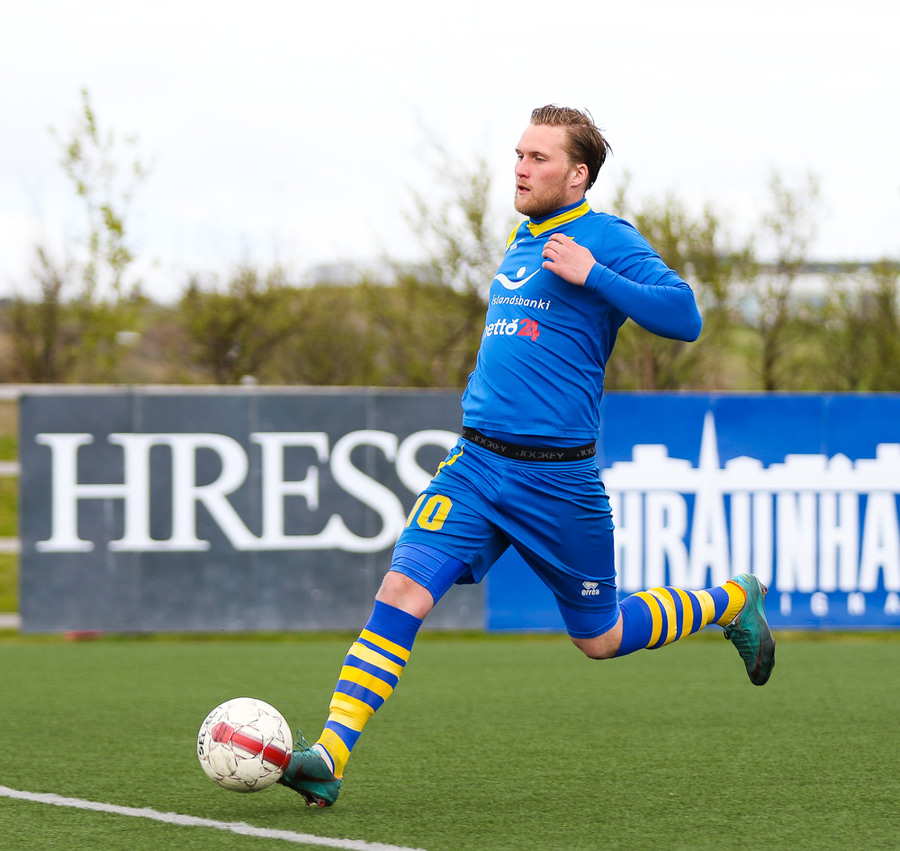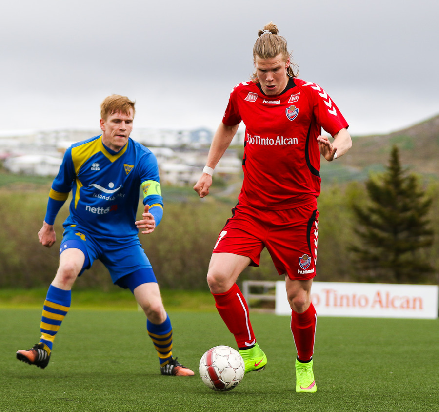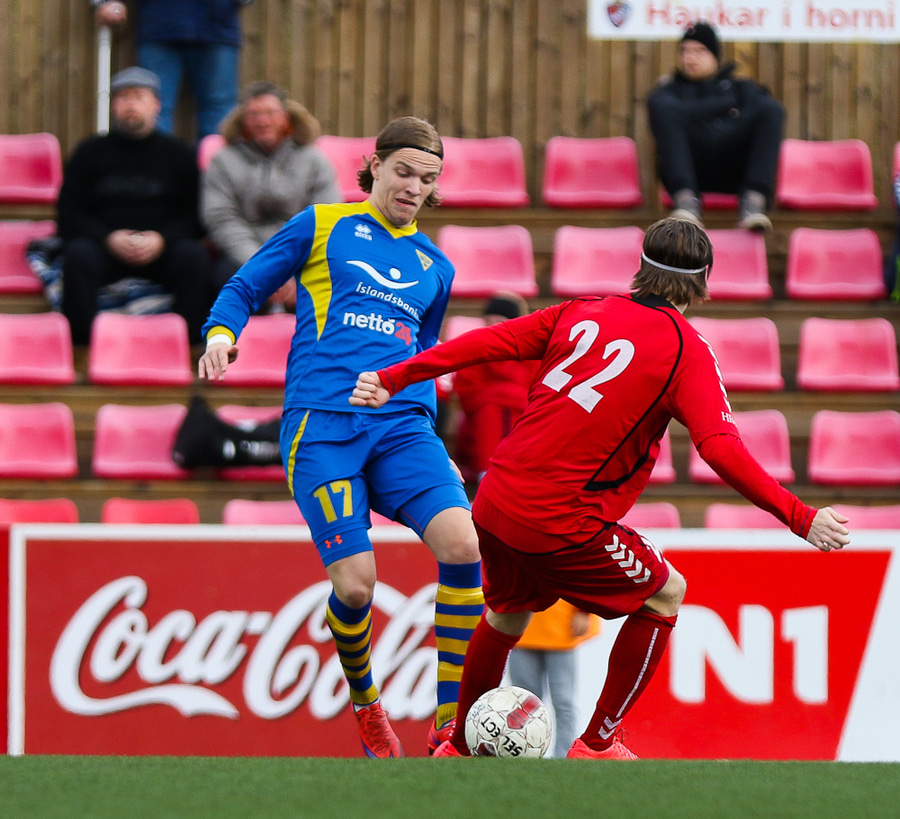 Björgvin við það að sleppa í gegn en fyrsta snertingin hans sveik hann og hann vinnur horn.