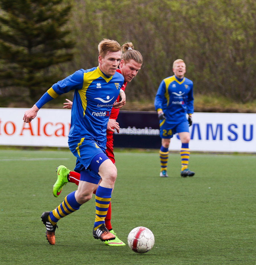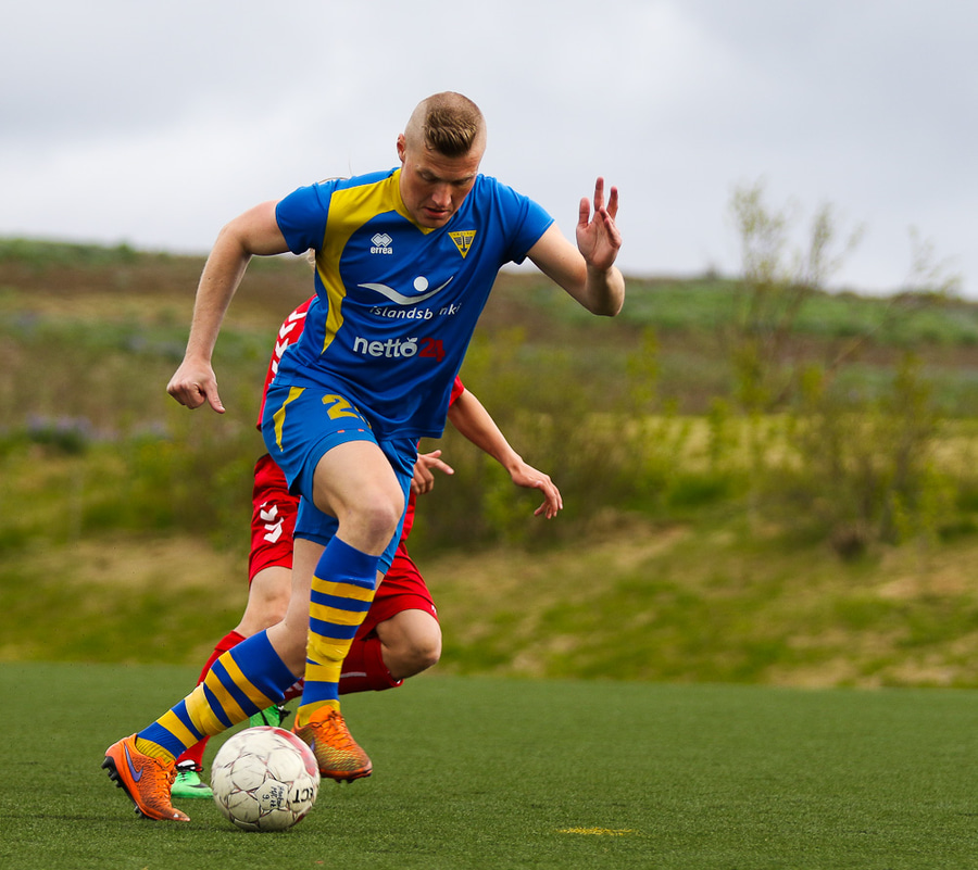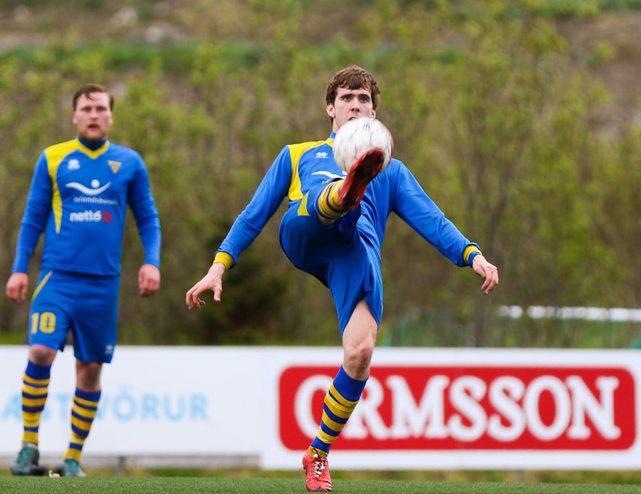 Kristján Ómar lætur Þórð Jón fá dauðafæri á silfurfati, en Þórður skallar í hliðarnetið. Þarna hefði Þórður átt að gera betur.