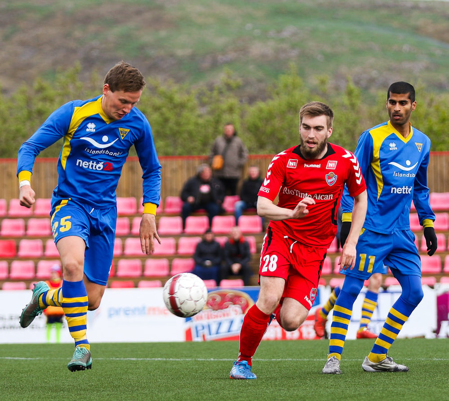 Aron Jó. þrumar boltanum upp völlinn, Benis Krasniqi fær boltann undir engri pressu og ætlar að senda á Guðmund í miðverðinum, en boltinn fer hinsvegar framhjá Guðmundi og beint á Björgvin sem klárar færið vel. Framhjá Árna Frey í markinu.
