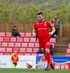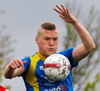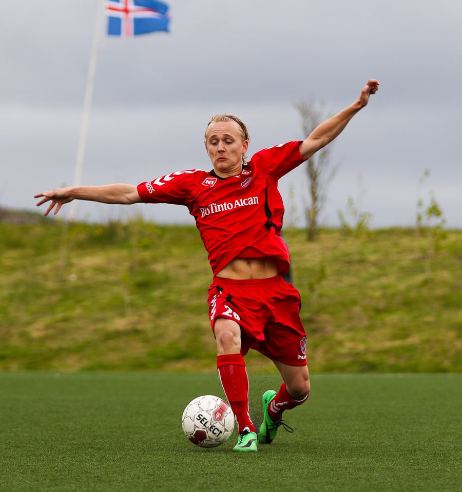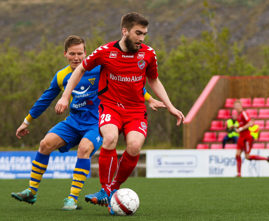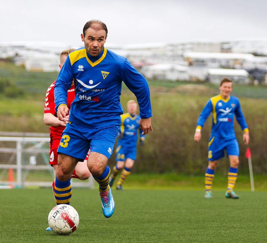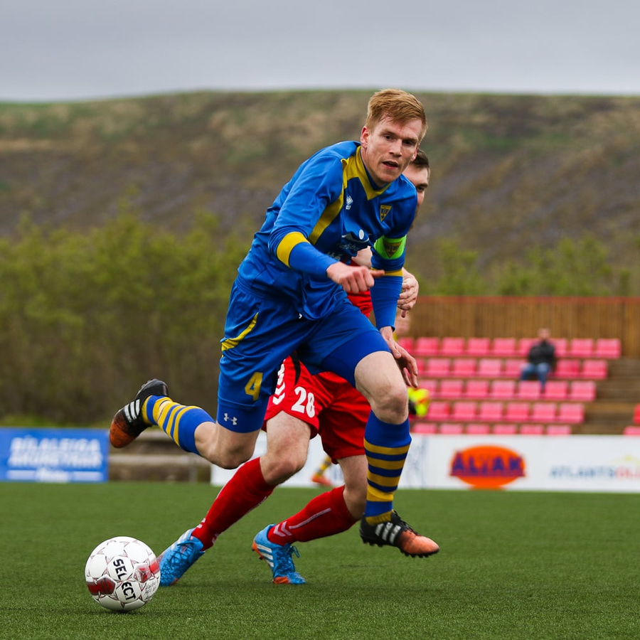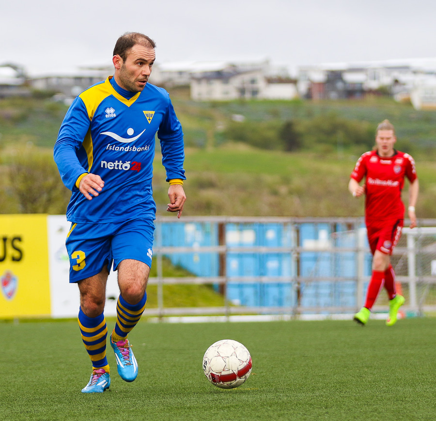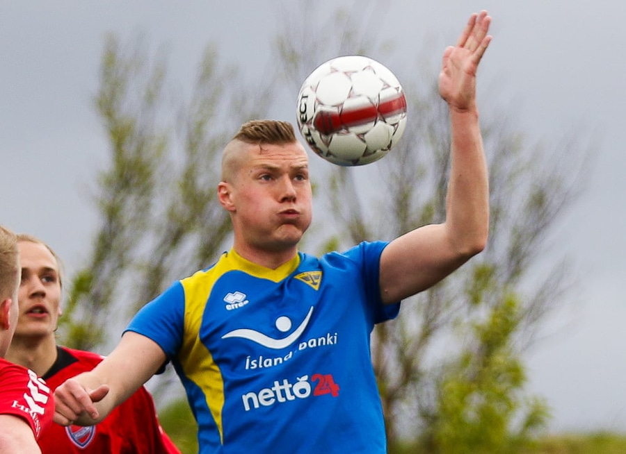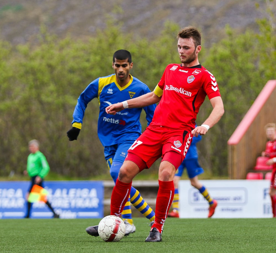 Brýtur á Ósvaldi og fær að launum gult spjald.