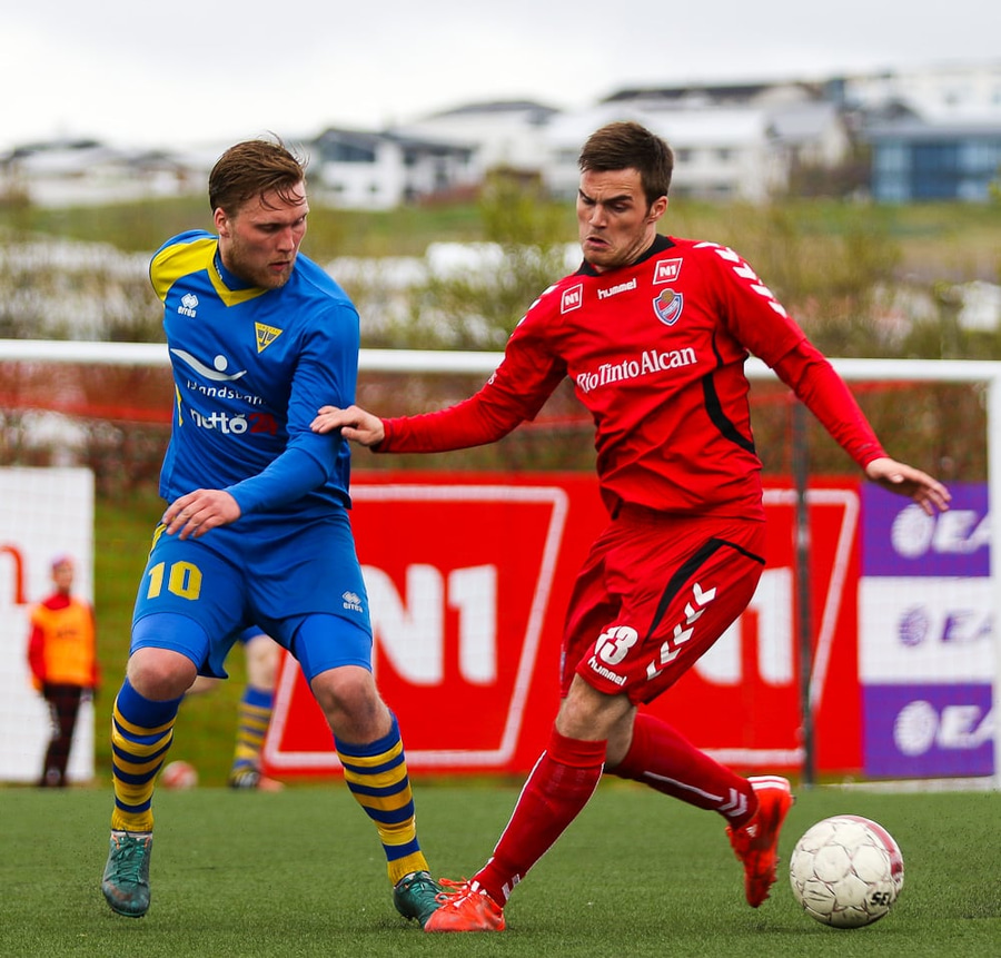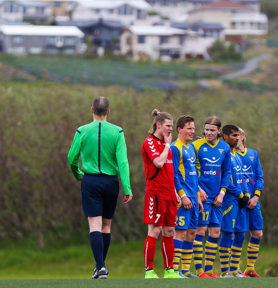 Björn Þorláksson og Haukur Björnsson liggja báðir. Standa þó báðir upp og verða komnir inná völlinn áður en maður veit af.