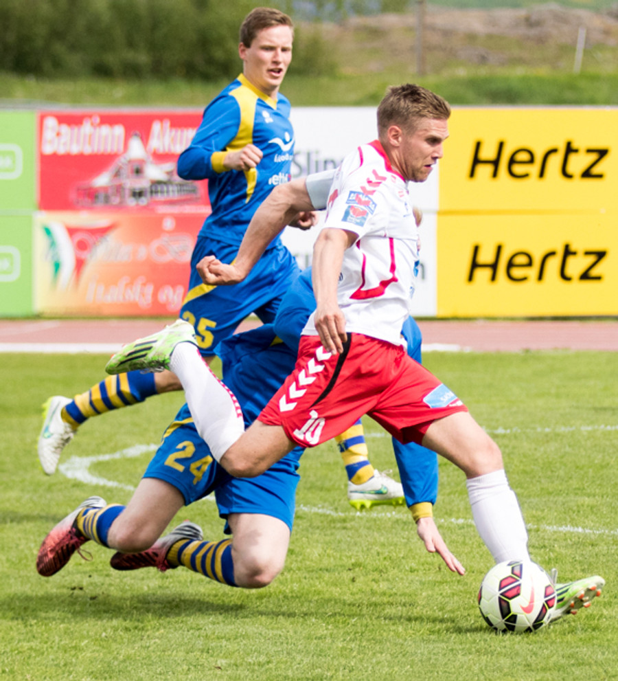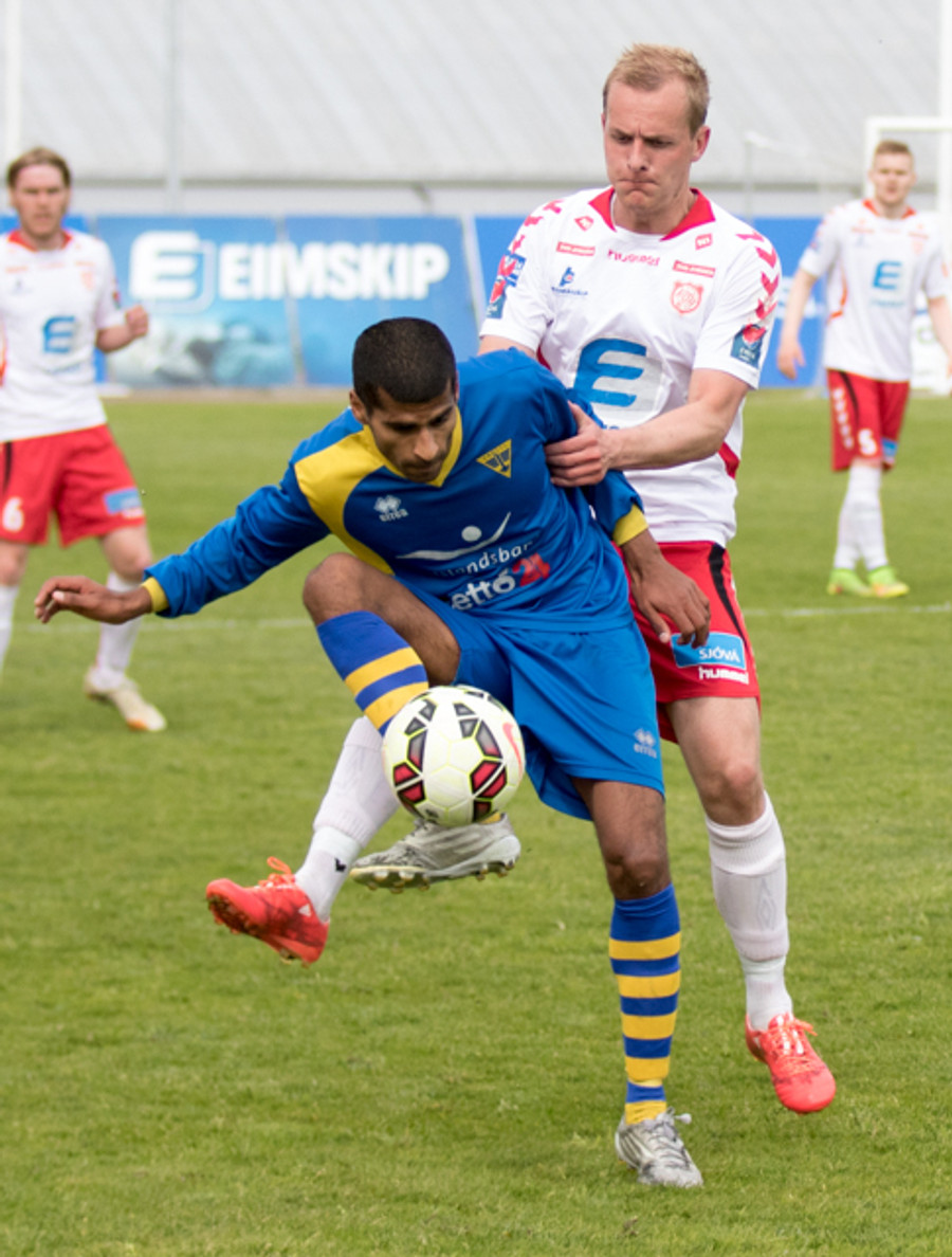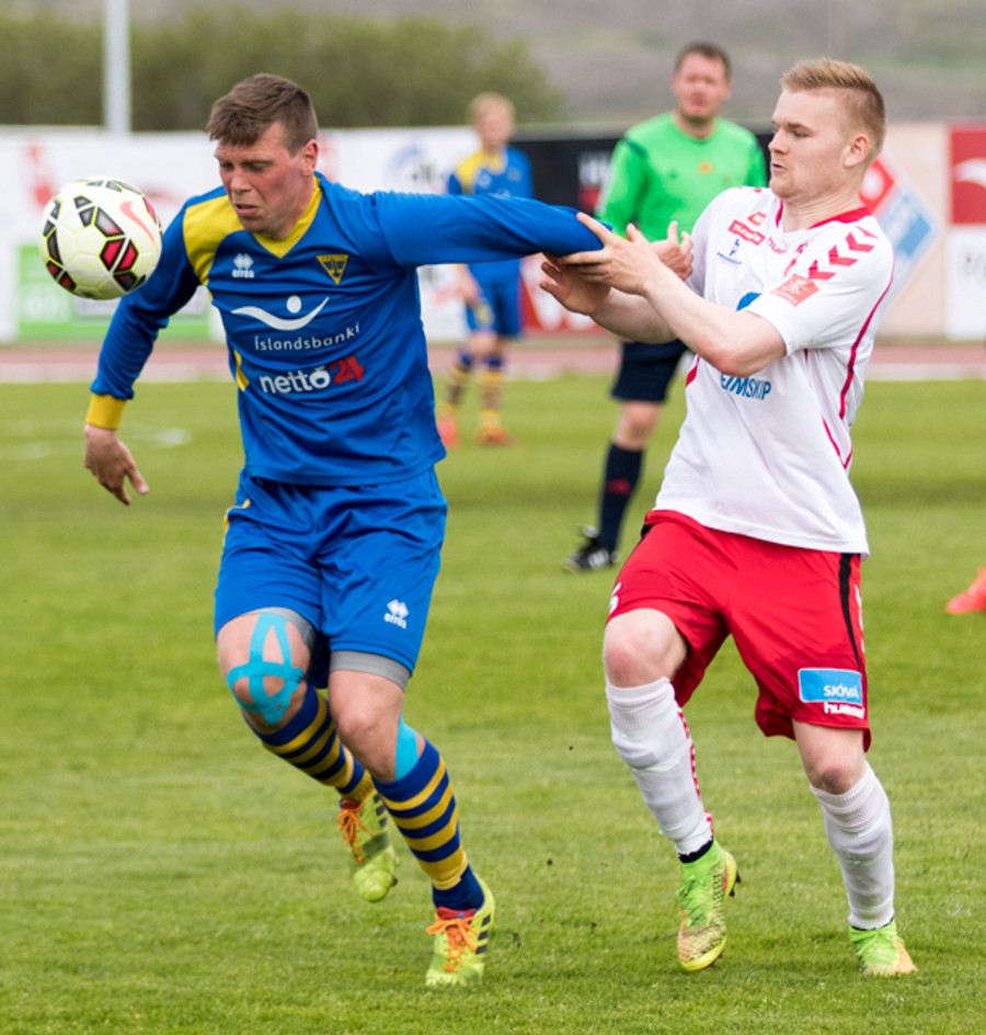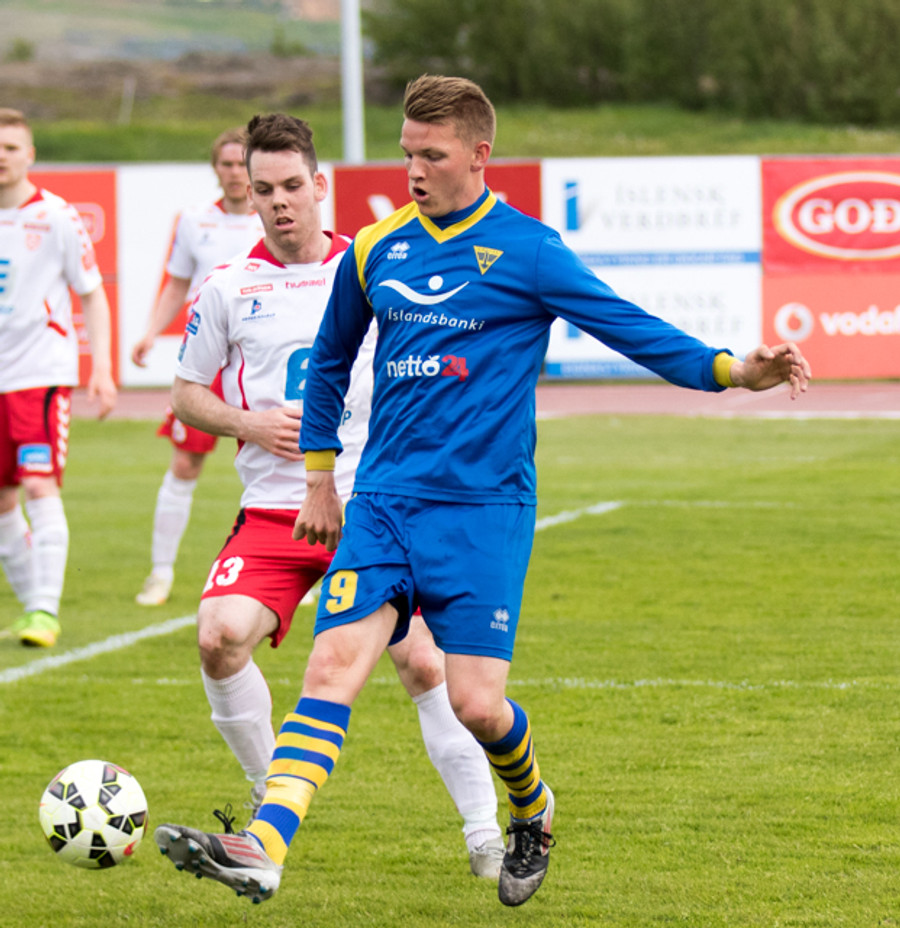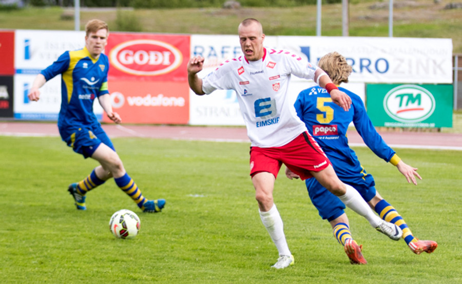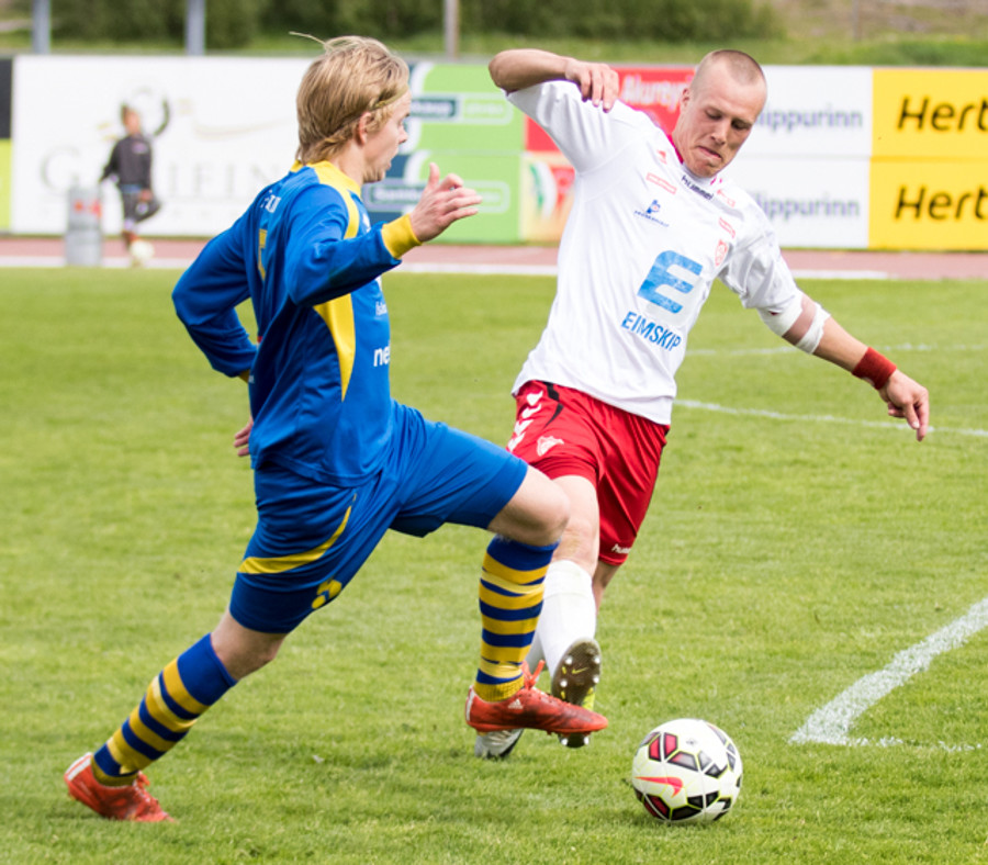Alltof alltof seinn í tæklingu og sparkar Svein Elías niður. Heimamenn fá svo hornspyrnu upp úr aukaspyrnunni