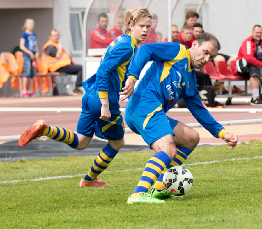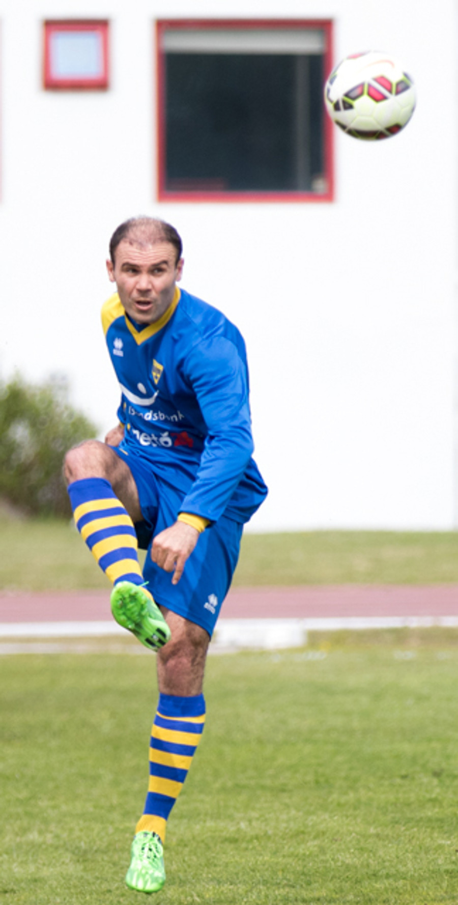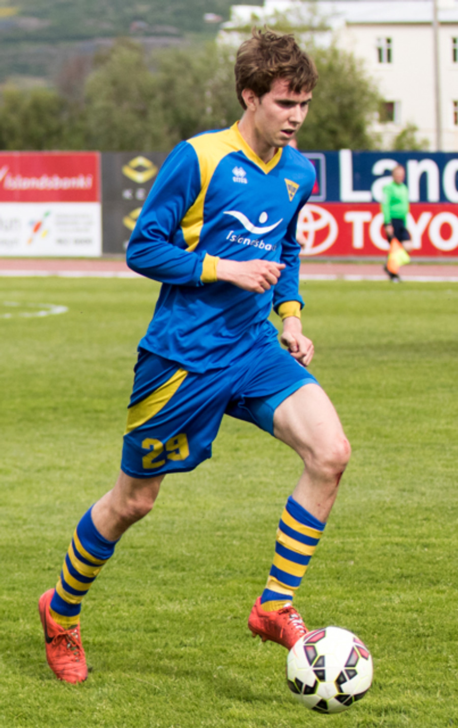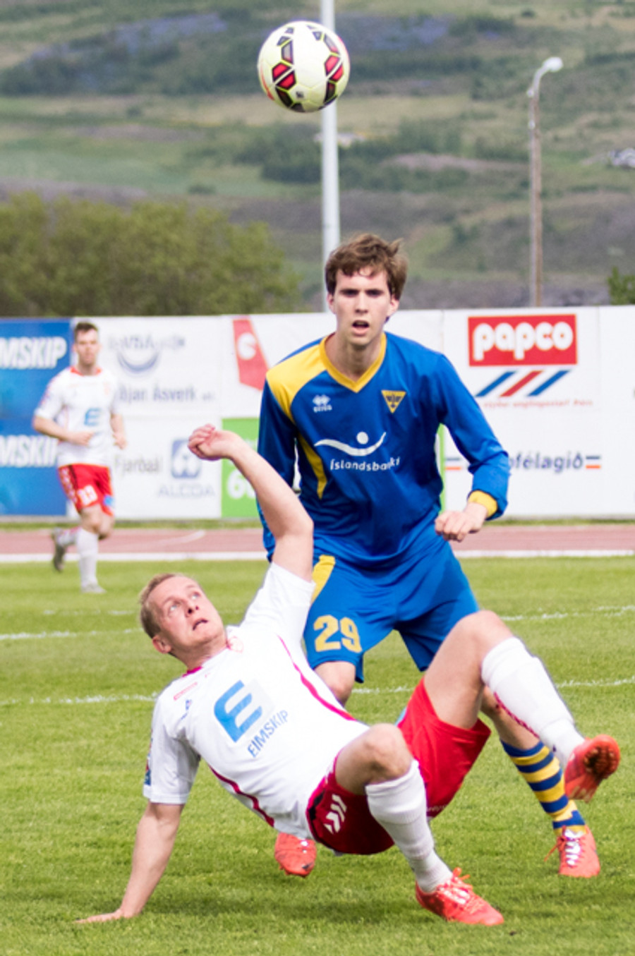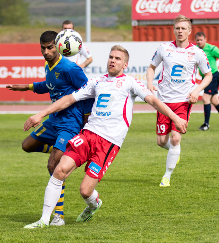 Alltof alltof seinn í tæklingu og sparkar Svein Elías niður. Heimamenn fá svo hornspyrnu upp úr aukaspyrnunni